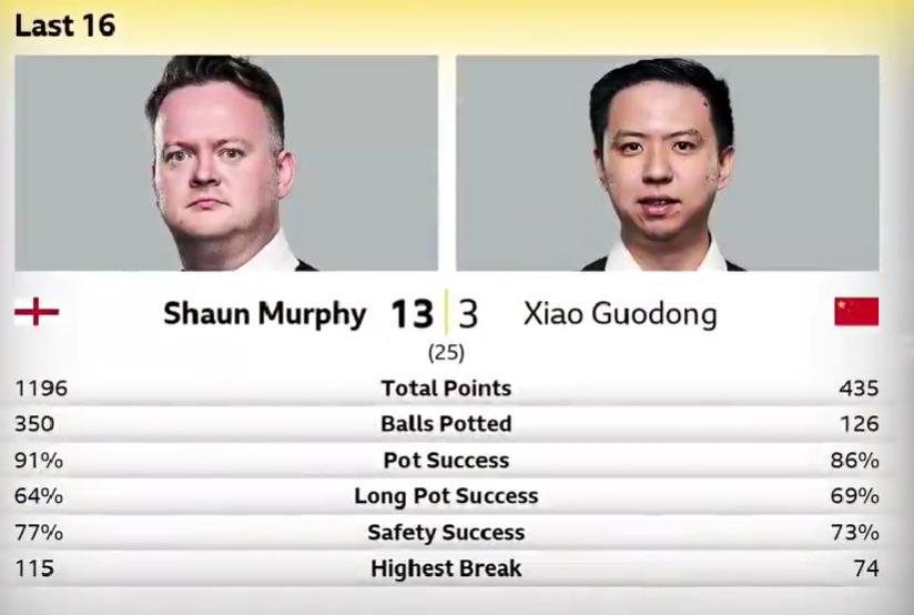 第一阶段墨菲6-2大比分领先肖国栋,第二阶段又打出7-1,可以说是碾压的局面。