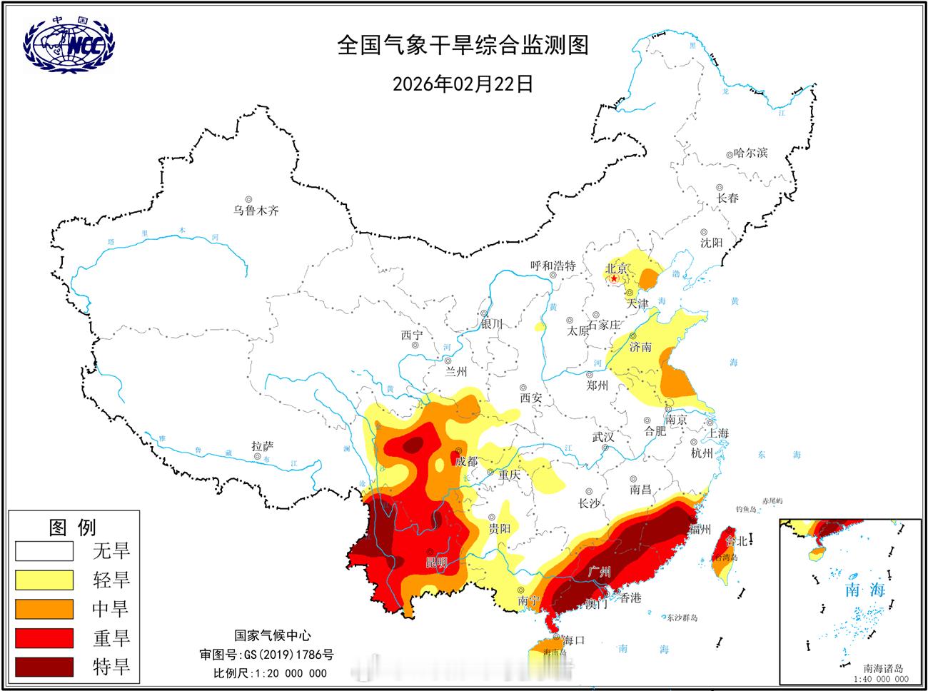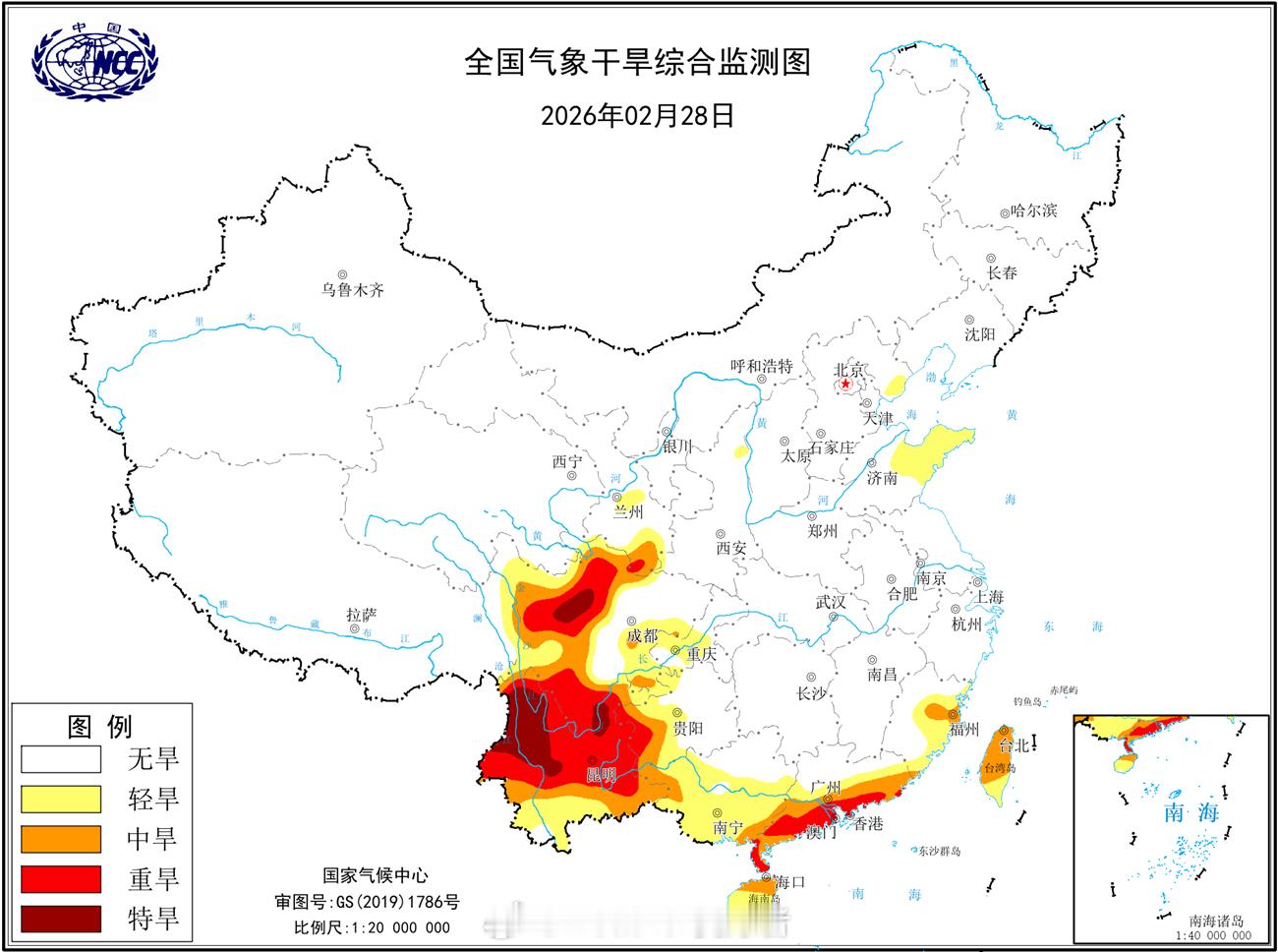 月底受冷空气过程带来的降水影响,华东南部气象干旱得到缓解,截至2月28日,西南地区西部、华南东南部等地有中至重度气象干旱,其中云南西北部等地存在特旱(图8)。