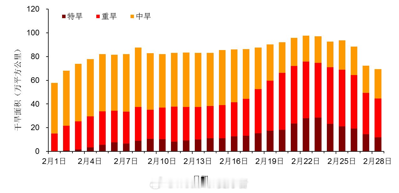 2. 西南地区西部、华南东南部气象干旱发展。入冬后,江南北部气象干旱一度发展,12月下旬起,随着冷空气带来的有效降水,气象干旱逐步缓解。2月以来,我国西南地区西部、华南东部及华东南部等地温高雨少,累计降水量较常年同期偏少8成以上,气象干旱迅速发展,2月22日,中旱及以上面积达到最大(97.5万平方公里),2月23日,特旱面积达到最大(28.6万平方公里)(图7)。