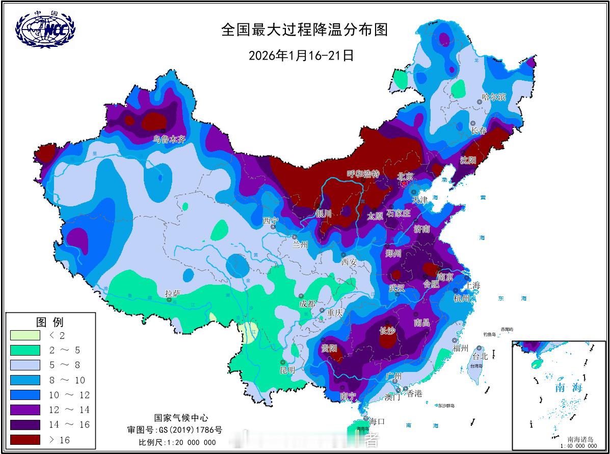 过程最大降温幅度超过8℃的面积约494.7万平方公里;我国大部地区出现大风、降温、雨雪和沙尘天气,华北、黄淮等地出现入冬以来首次大范围明显降雪过程。2026 年 1月16—17日和 1月19—21日,由强冷空气和全国型寒潮引起的低温灾害事件接连影响我国,大部地区剧烈降温(图6)。