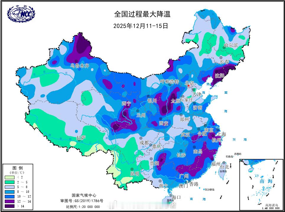 最大降温幅度超过12℃的国土面积约278万平方公里,自新疆北部、内蒙古西部及河套地区向东南延伸至黄淮南部、江淮、江南中西部等地;冷空气南下跨越南岭影响到广西和广东北部,最低气温0℃线南压至华南北部。受其影响,西北地区东部、华北、东北地区出现小到中雪,北京局地大雪;黄淮、江淮、江汉及江南北部等地雨雪相态复杂;贵州、湖南、湖北等地出现冻雨和电线积冰。