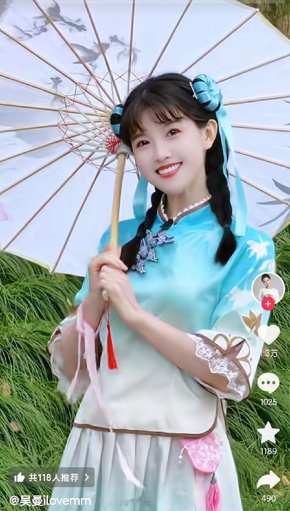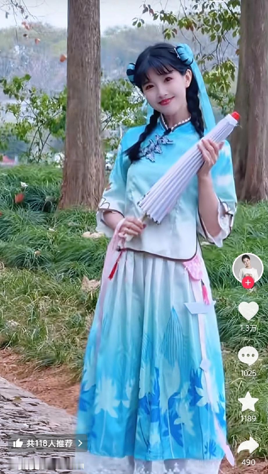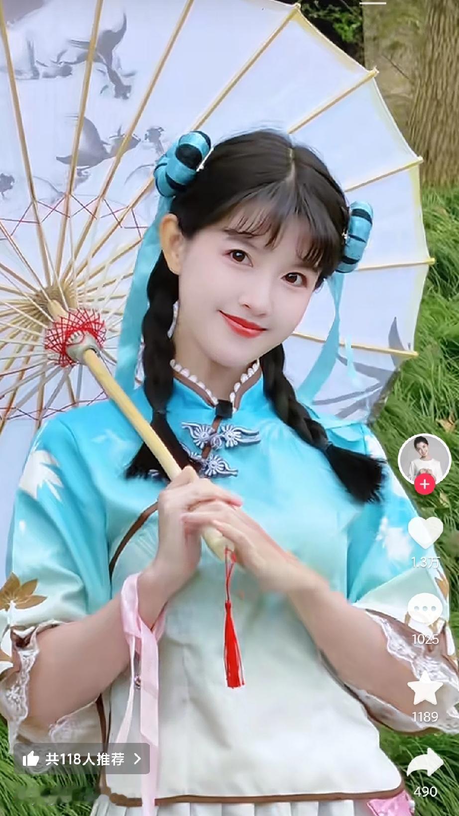在这样的服装映衬下,美女明眸温婉笑靥甜,柔婉清丽似水乡佳人。
