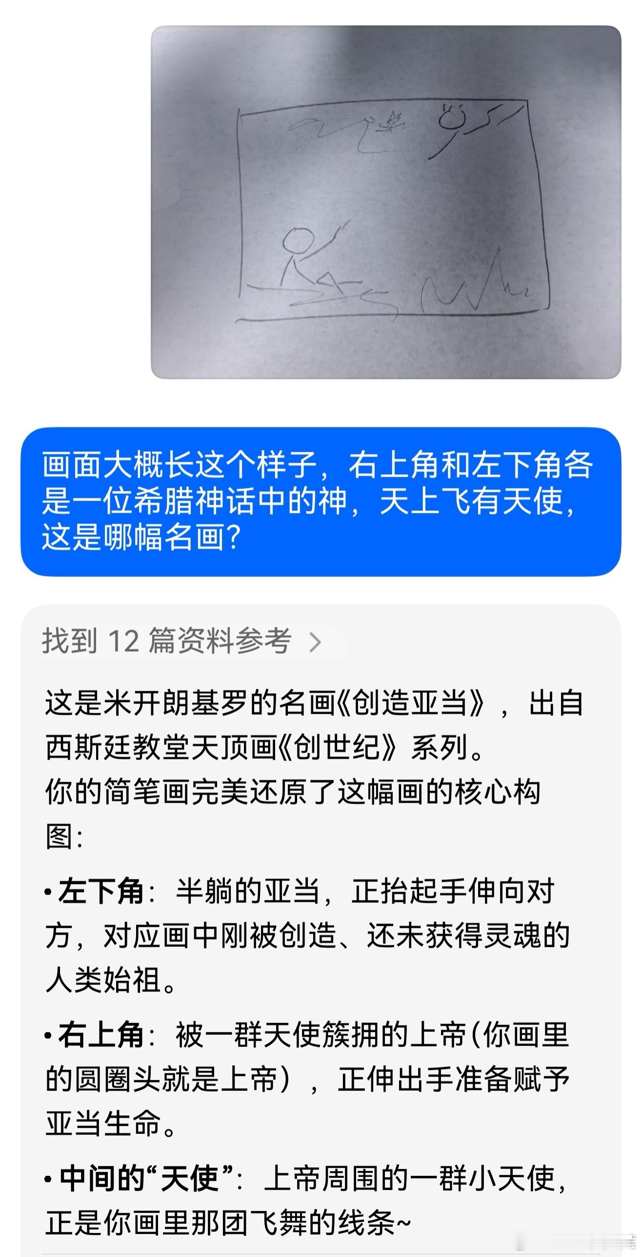昨晚吃饭时,记不清聊到啥了,鱼姐说起这幅画,大家都想不起来叫啥名字。姐画了个如此抽象的火柴人,AI居然真给猜出来了,还不忘了夸夸……