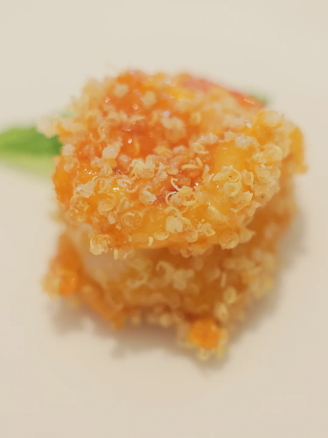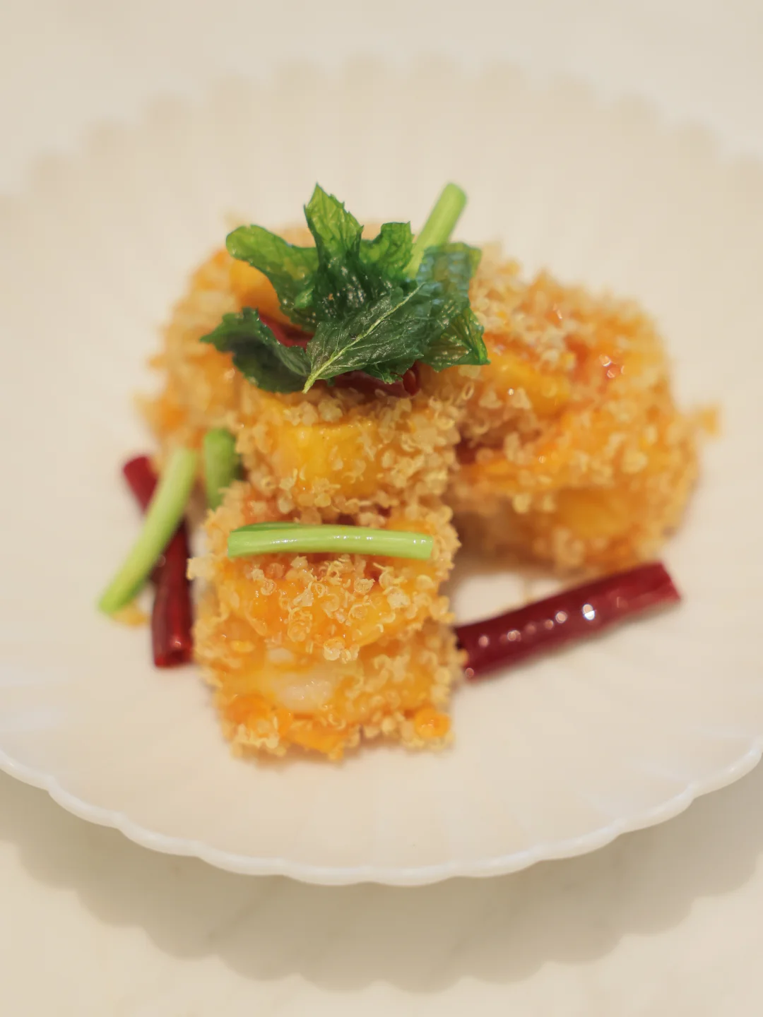 尤其是后面炸藜麦的酥脆搭配甜辣油和年糕的组合,让虾球都显得无聊了,很小孩菜,我还是蛮喜欢的!