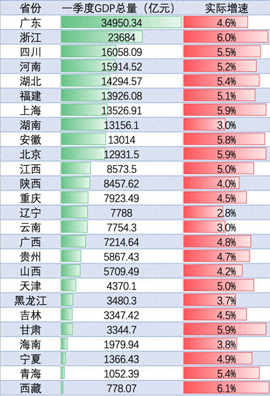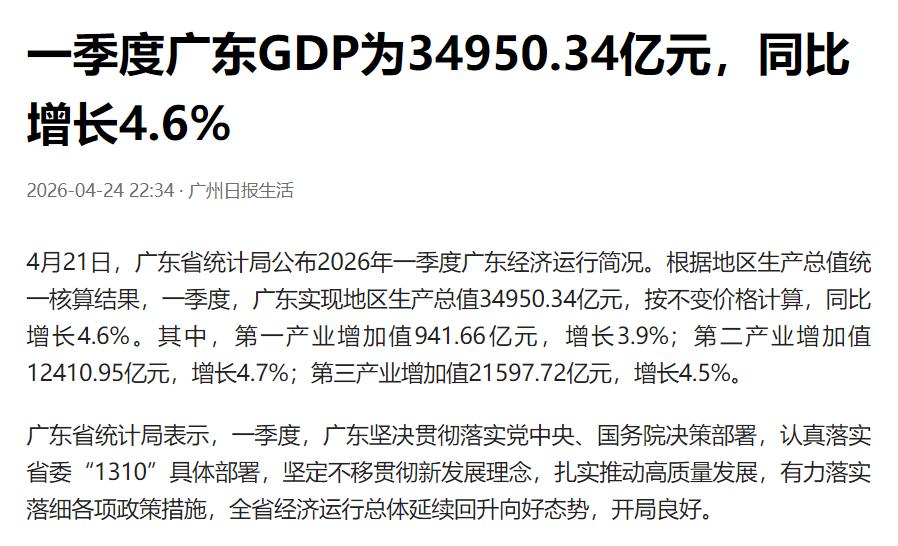 千年老二江苏一直在追赶广东,眼看着距离越来越近,没想到又扩大了。2026年一季度GDP都公布了,广东GDP为34950.34亿元,同比增长4.6%;江苏为34483亿元,同比增长5.4%。