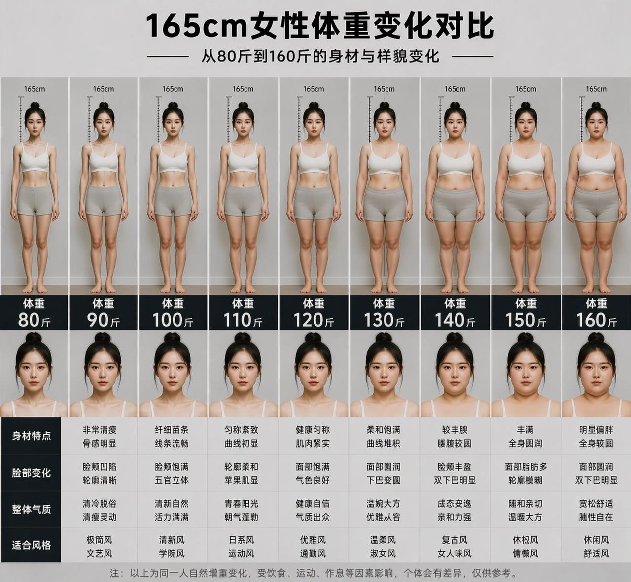 图片直观地展示了身高175cm的男性从90斤到180斤,以及165cm的女性从80斤到160斤的体型与样貌演变。不仅仅是体重的数字差异,更是一场关于气质、样貌甚至人生风格的“大洗牌”。