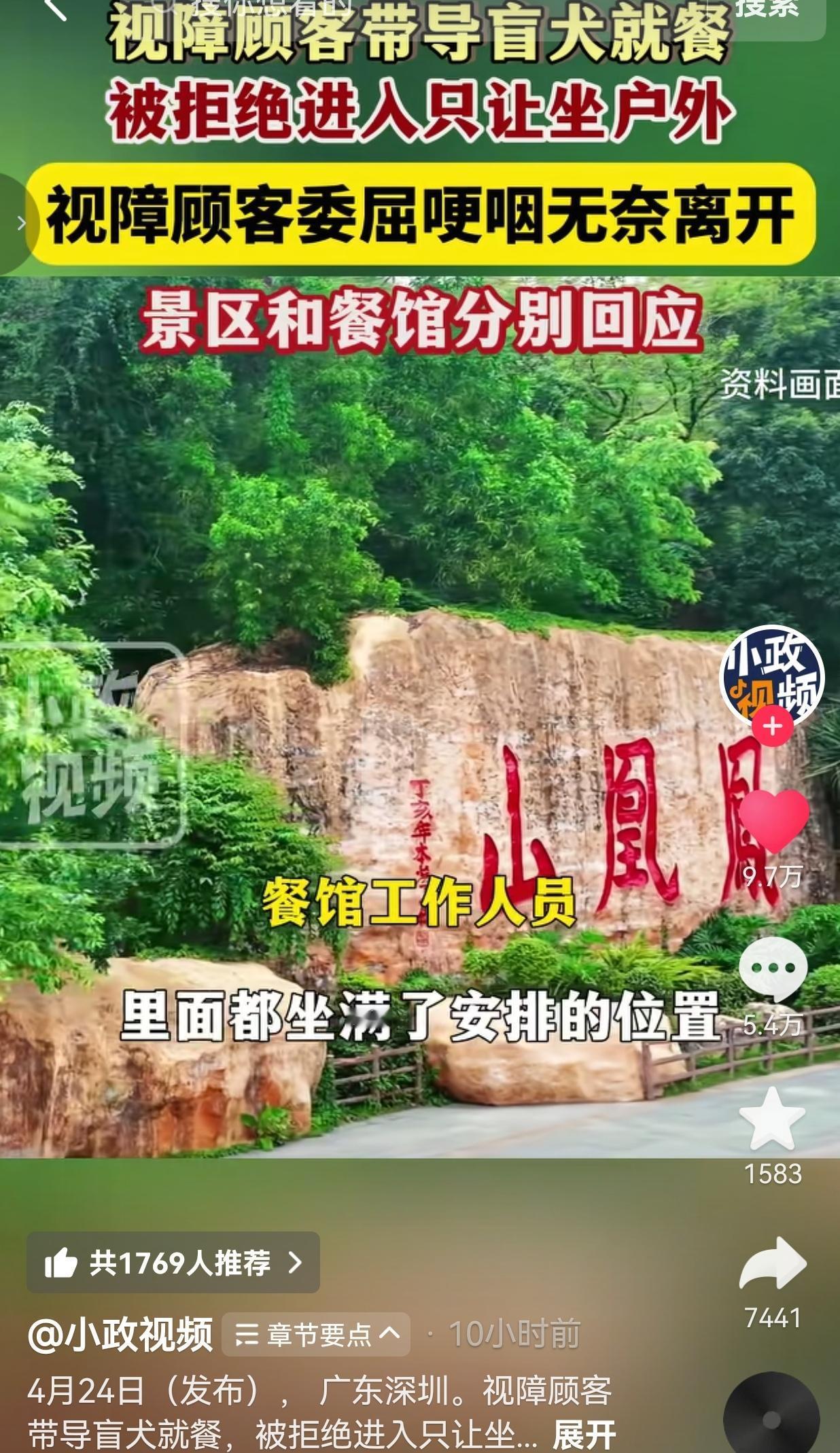 这事发生在深圳凤凰山森林公园,一名视障女子牵着自己的导盲犬,慢慢摸索走到景区里面的素菜馆,就想踏踏实实吃一顿热饭填饱肚子。可刚走到大门口,直接就被店员拦了下来。