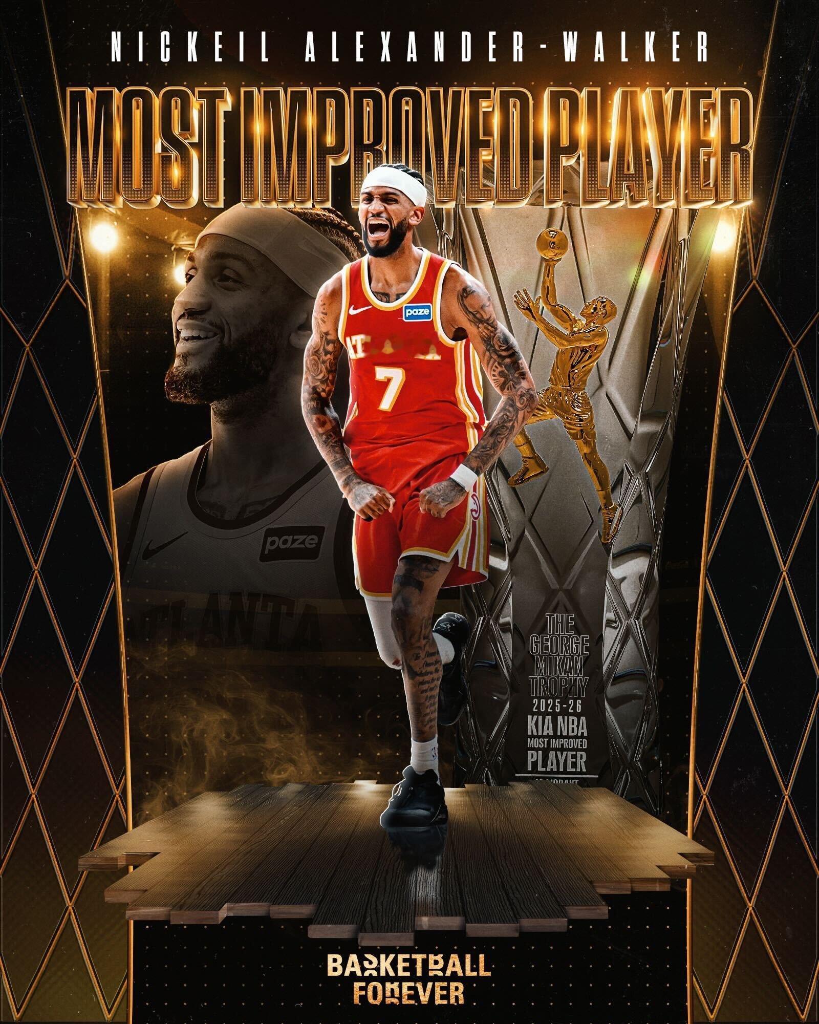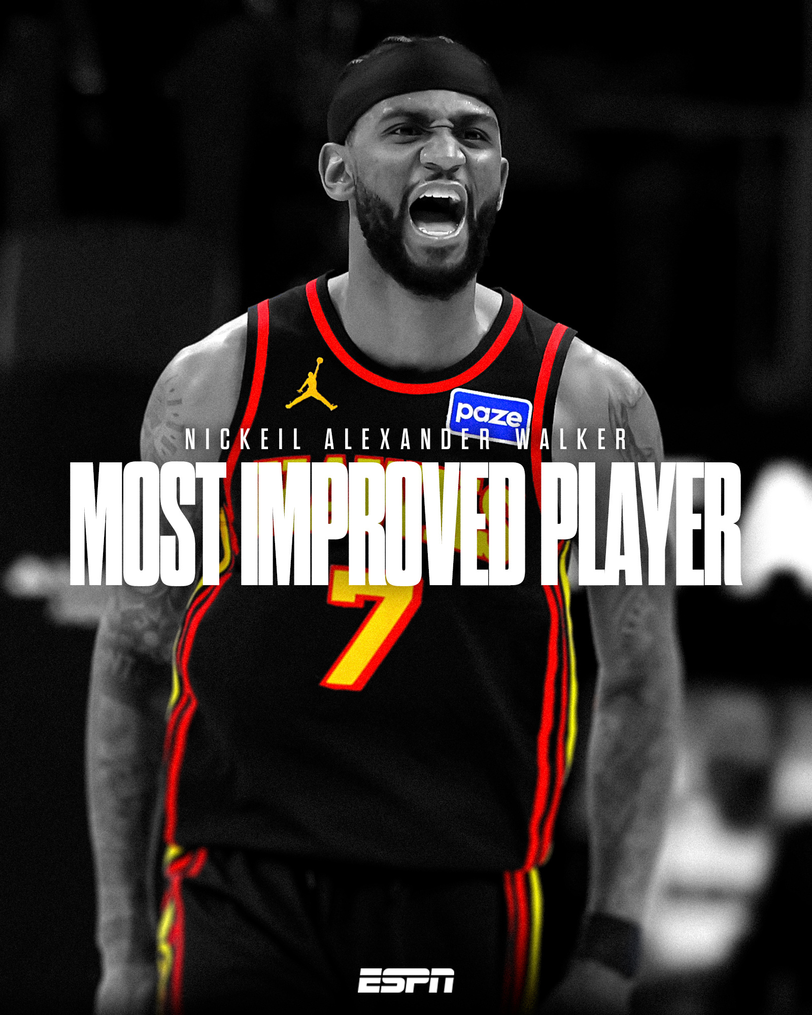 亚历山大-沃克当选进步最快球员,拿到了66张第一选票,老鹰也连续两个赛季拥有了进步最快球员。