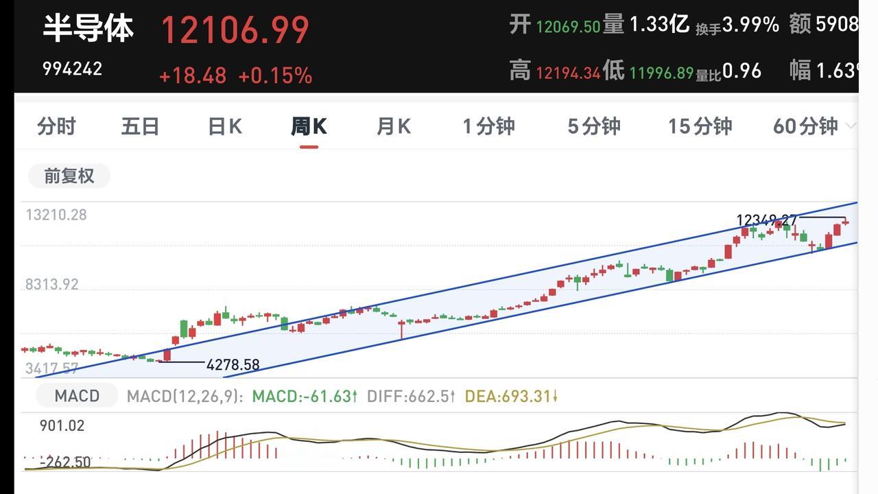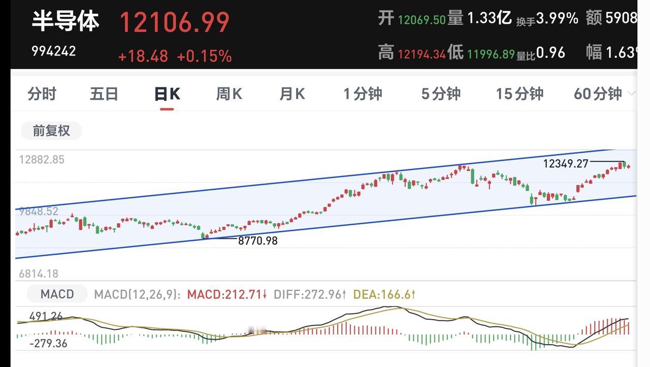 半导体板块日线级别处于上涨通道中,距离上涨通道的下轨线还很远,小幅度的下跌都改变不了这个板块日线级别的上涨趋势,短线持有的人继续持有,在下跌跌破这个上涨通道下轨线的时候,再考虑要不要止盈出来观望。