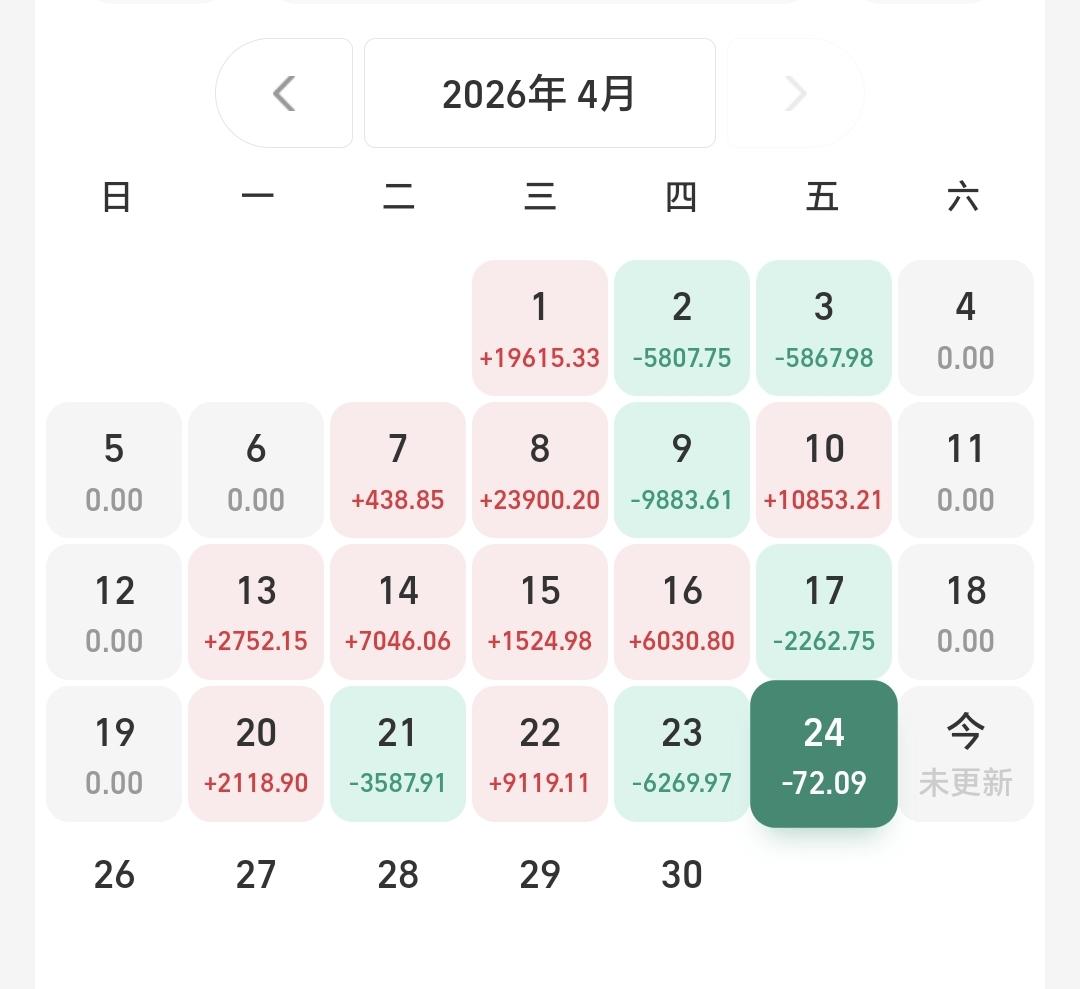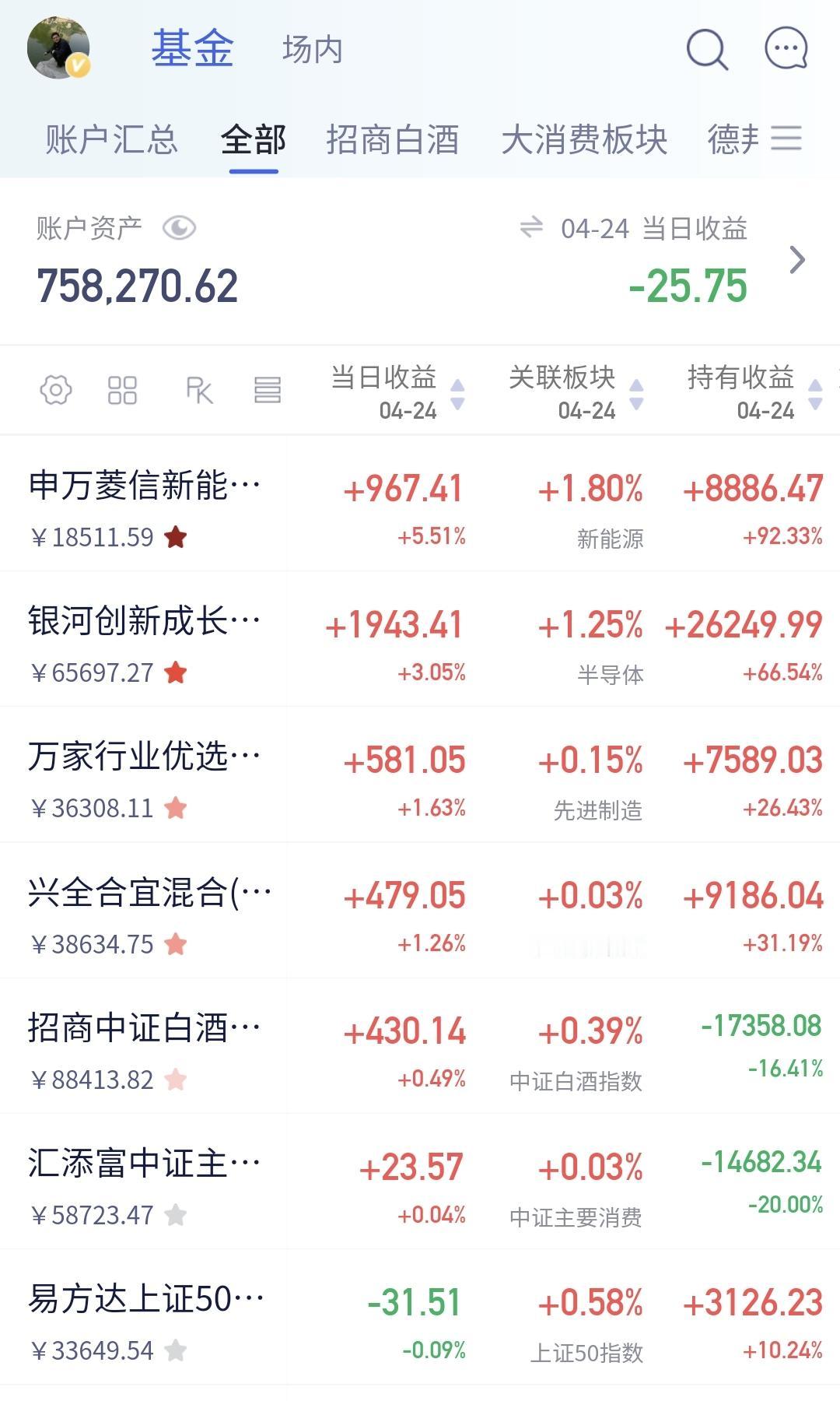 昨天基金亏损72元,基金持有767063元,现金持有1229479元,资产总额1996543元,在200万附近震荡。