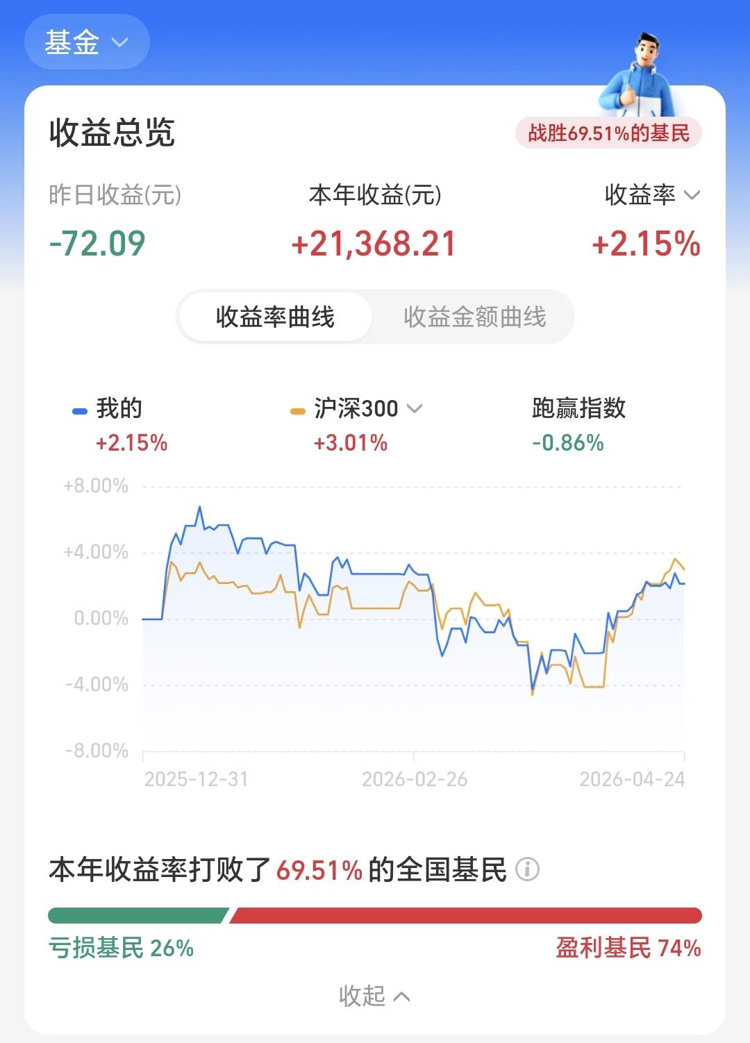 今年以来收益21368元,收益率2.15%,跑赢了全国69.51%的基民,跑输了沪深300指数3.01%的上涨幅度。