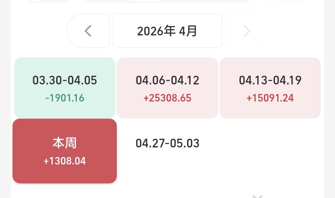 上周五个交易日中,两赢三亏,两个交易日盈利,三个交易日亏损,周收益1308元。