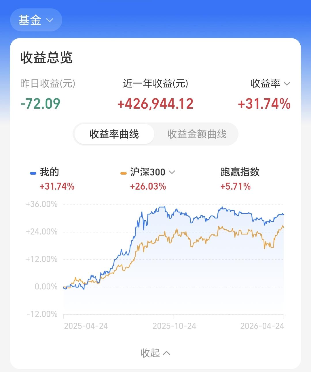 近一年以来收益426944元,收益率31.74%,跑赢了沪深300指数26.03%的上涨幅度。