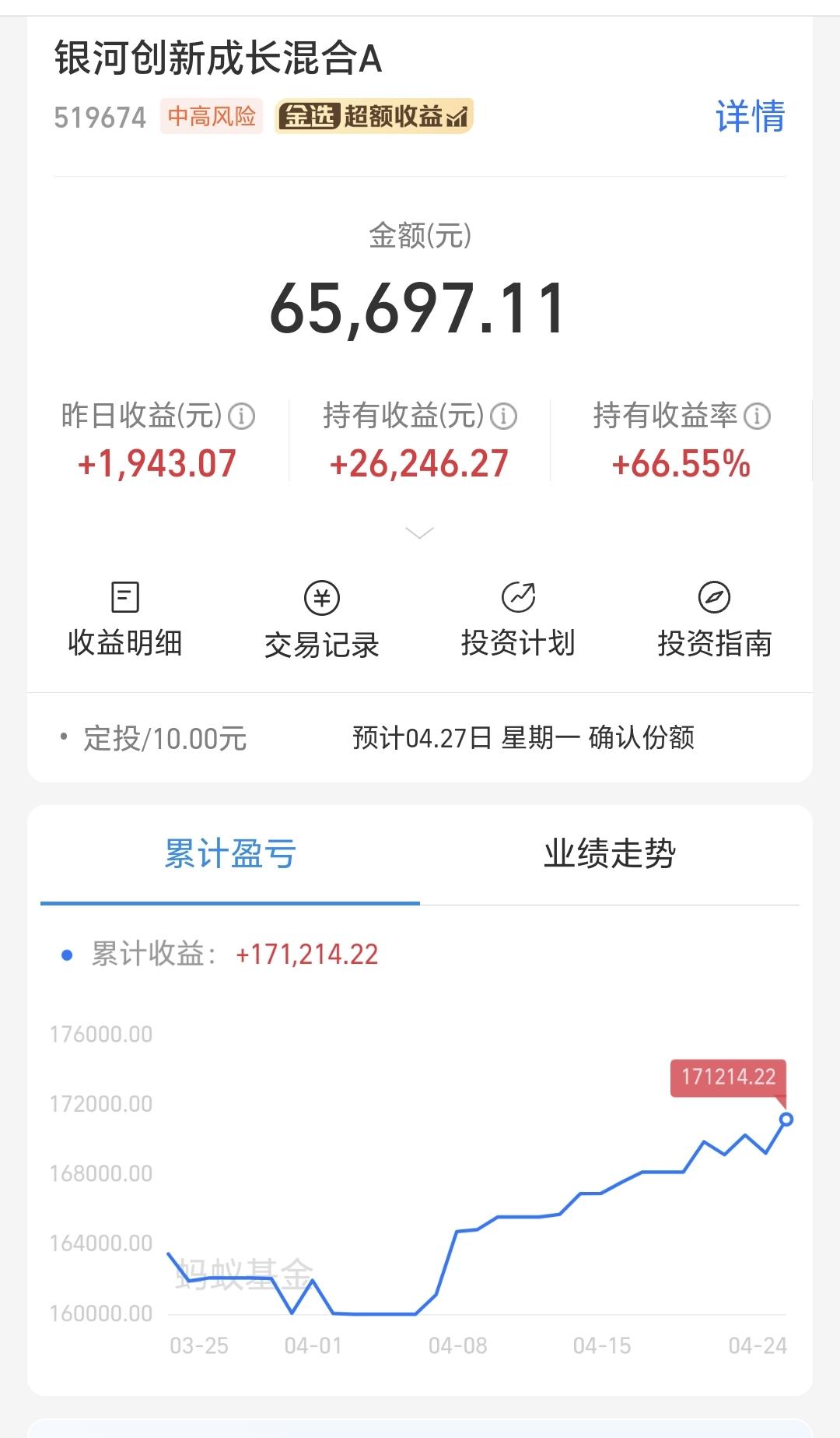 芯片半导体板块基金银河,我持有65697元,持有收益26246元,持有收益率66.55%,累计收益171214元,每天定投10块钱。