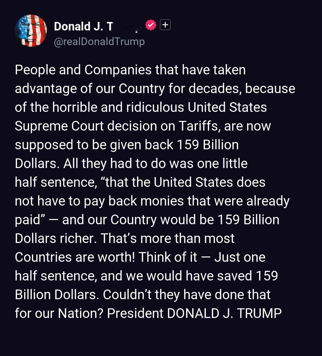 突发新闻:非常不想还钱的特朗普今天(北京时间4月25日)写道:“那些几十年来一直利用我国的个人和企业,由于美国最高法院在关税问题上做出的糟糕且荒谬的裁决,现在竟然要得到 1590 亿美元的退款。他们只需说一句简短的话:‘美国无需退还已支付的款项’——我们的国家就能多出 1590 亿美元。这比很多国家的总值还要高!想想看——就半句话,我们就能省下 1590 亿美元。他们就不能为我们的国家这么做吗?”