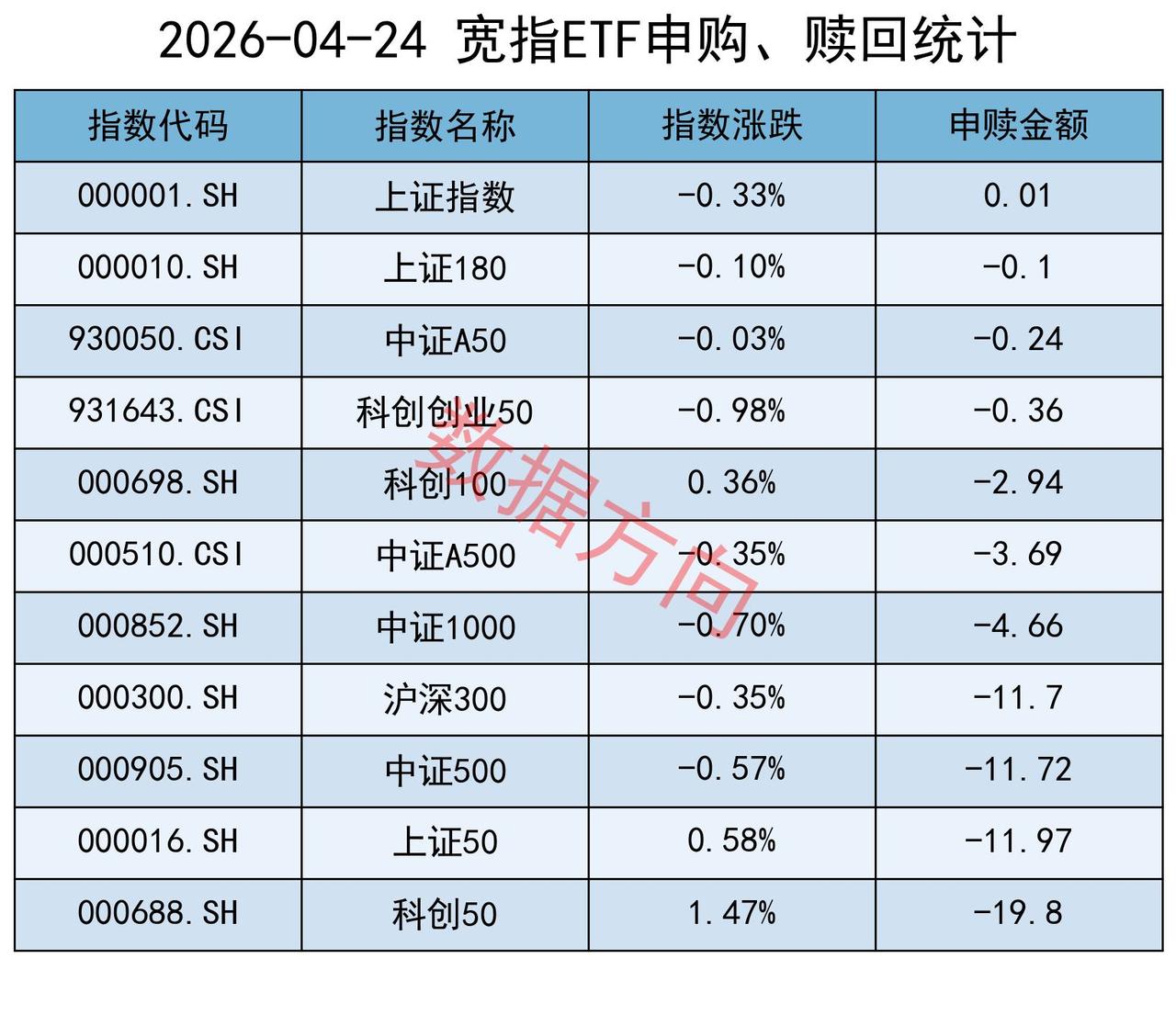 中证1000指数(-4.66亿)、中证A500指数(-3.69亿)、科创100指数(-2.94亿)、科创创业50指数(-0.36亿)、中证A50指数(-0.24亿)、上证180指数(-0.1亿),净赎回都在5亿之内。