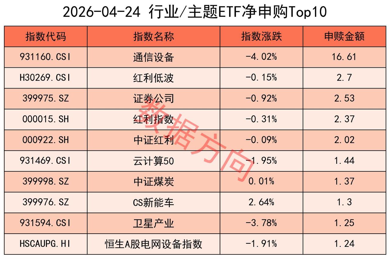 其他进入申购榜的还有证券公司指数(2.53亿)、CS新能车指数(1.3亿)、卫星产业指数(1.25亿)、恒生A股电网设备指数(1.24亿)。