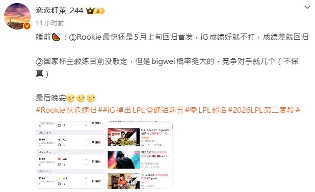 理想很丰满,现实很骨感。iG 在经历了第二赛段开局的惊艳后,目前正深陷连败泥潭。恋恋红茶发文称:Rookie最快5月上旬回归,iG成绩好就不打,成绩差就回归!电竞国家杯主教练目前没敲定,但是bigwei概率挺大的。