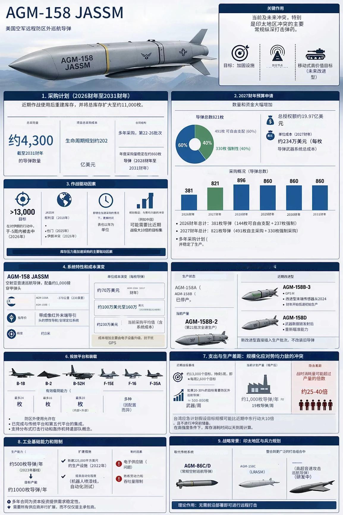 2026年采购数量是什么概念?从入侵伊朗的数据上看,在大约五周内,伊朗超过13000个目标遭到打击,相当于每周约2600个。假如此类行动中20~30%的目标需要巡航导弹,那么周发射量500~800枚——在不看它和战斧导弹战斗部重量差异的前提下,每周要打出去大约1.6-2.7个三百战斧。即,美国今年采购的JASSM都不够一周打的。