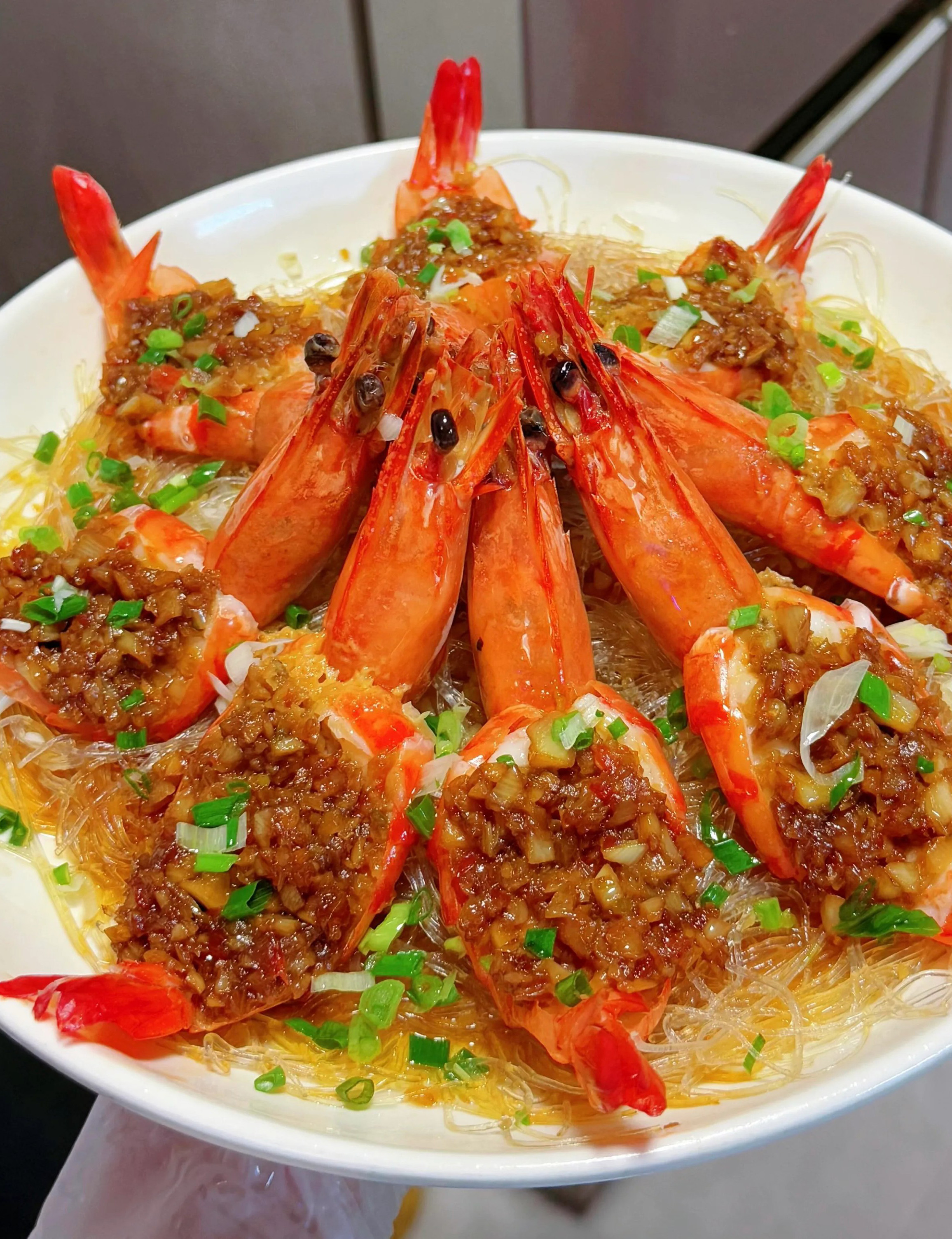 👉 做法:粉丝温水泡软铺在盘底;鲜虾开背去虾线,摆在粉丝上;蒜末➕小米辣➕生抽2勺➕蚝油1勺➕少许糖搅匀,铺在虾上;水开后上锅蒸8分钟,出锅淋一勺热油,撒葱花。