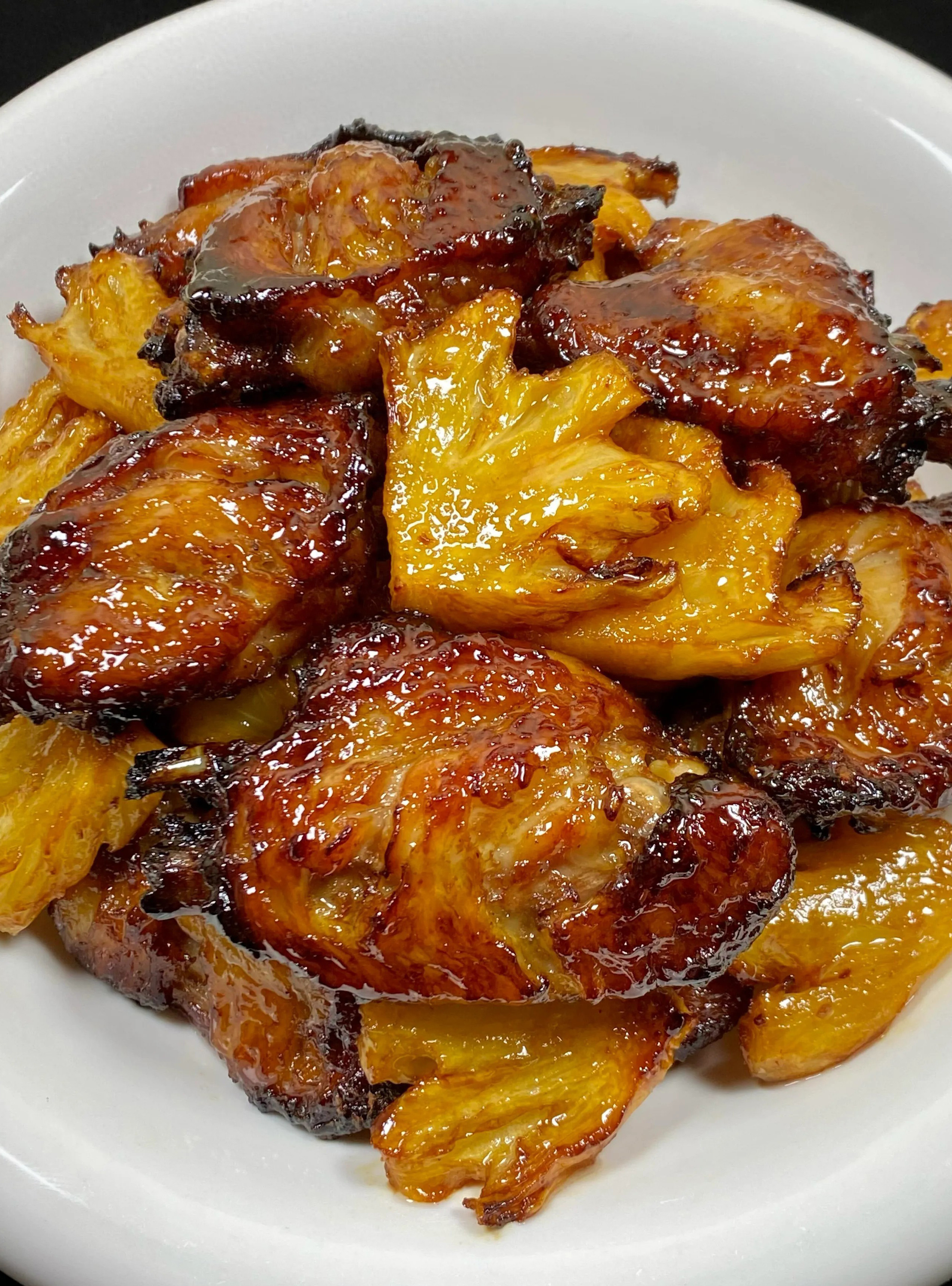 👉 做法:鸡翅两面划刀,用料酒、生抽腌15分钟;菠萝切块;热油煎鸡翅到金黄,加姜片、一勺生抽、半勺老抽、一碗水,焖10分钟;加入菠萝块再焖3分钟,收汁撒葱花。