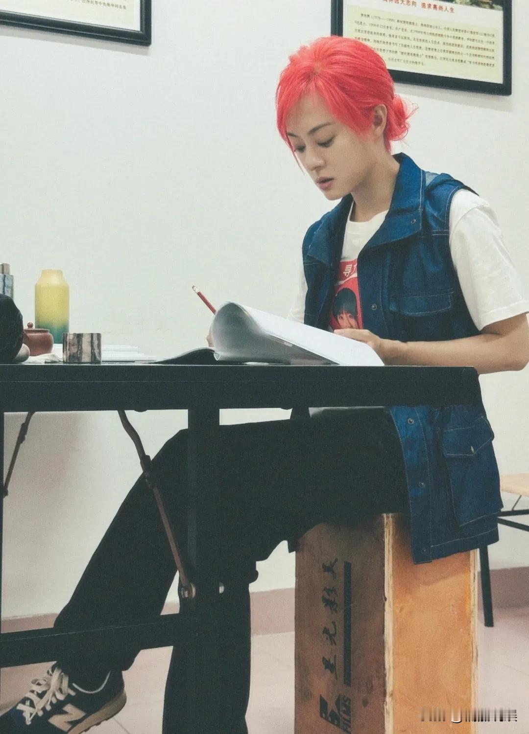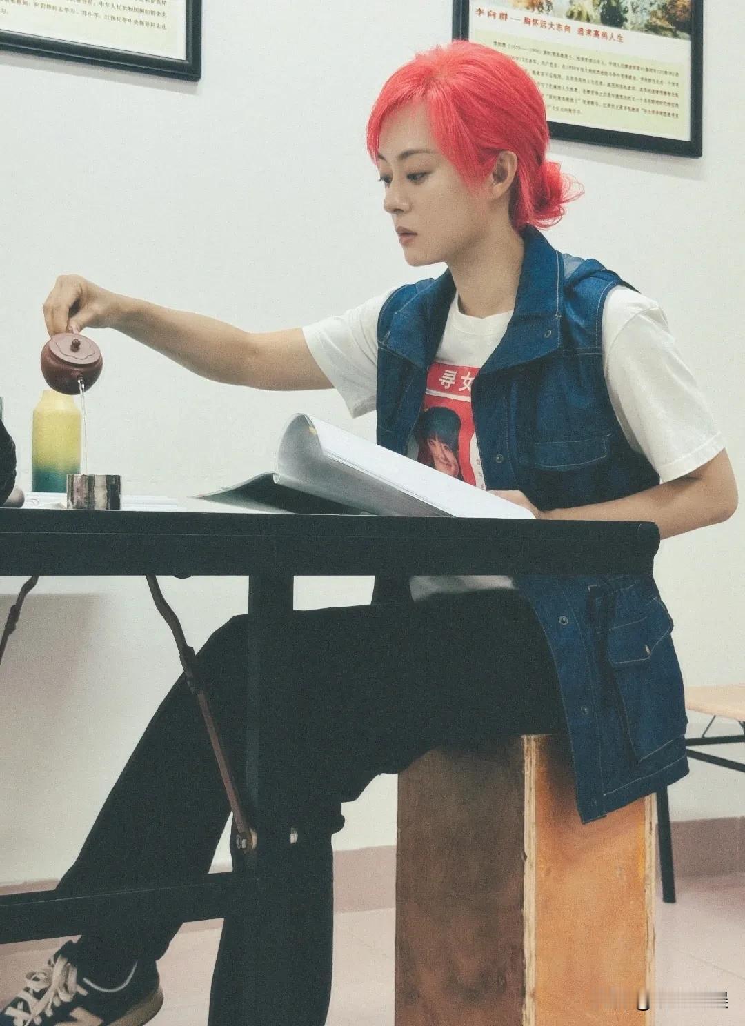 孙俪在福建厦门拍新剧,中场休息的她,扎着一头红发,身材清瘦,一边给自己冲茶,一边给剧本做笔记。