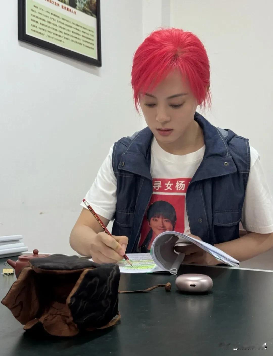 只见她坐在凳子上,拿着铅笔给剧本认真做笔记,还用荧光笔打了各种标记,累的时候喝杯茶调节一下,超级认真、仔细。