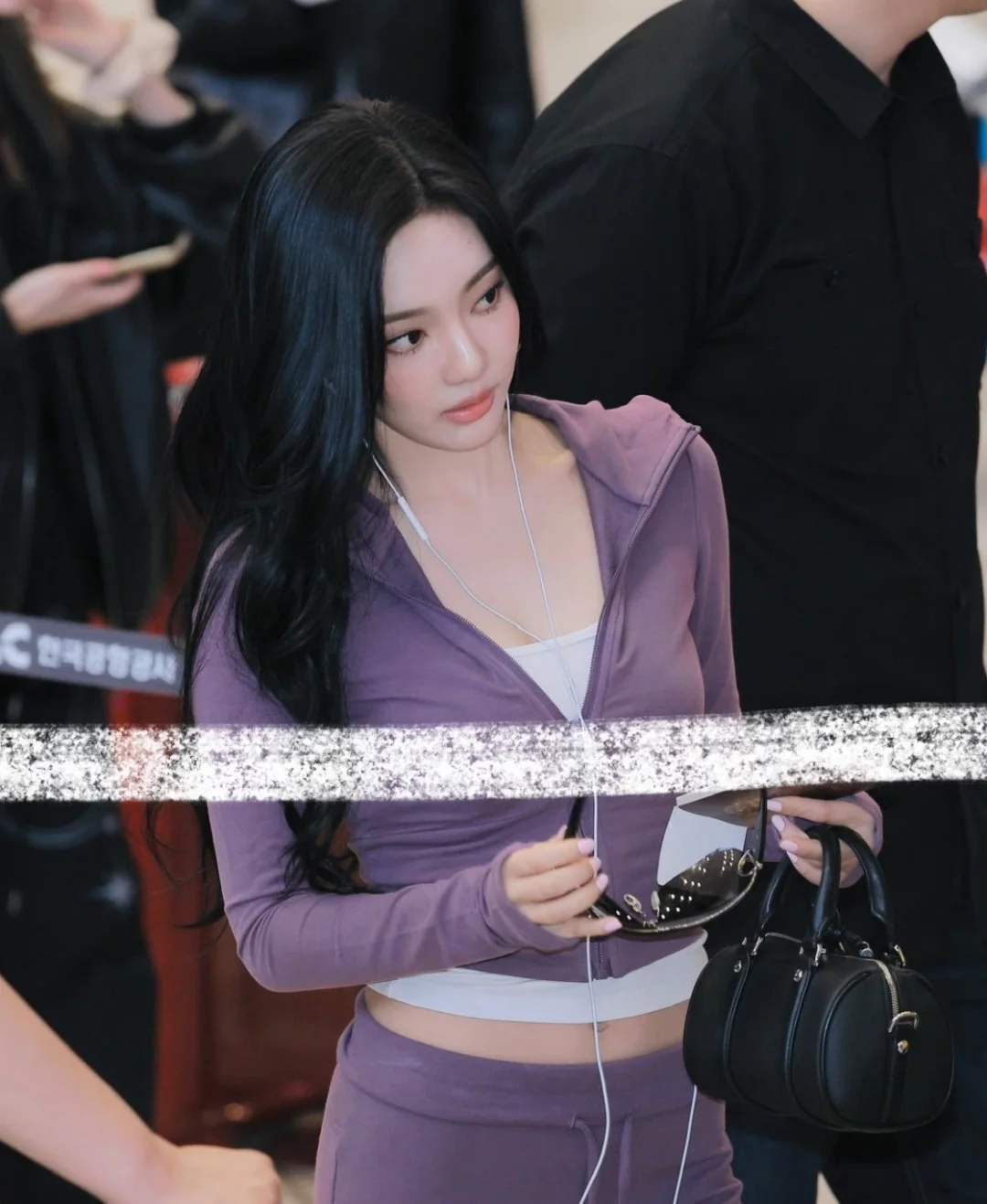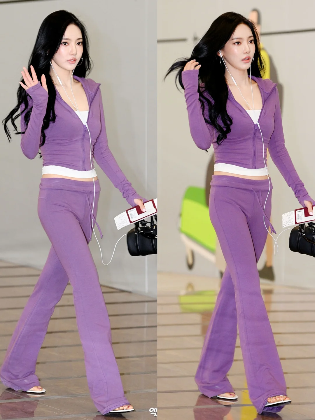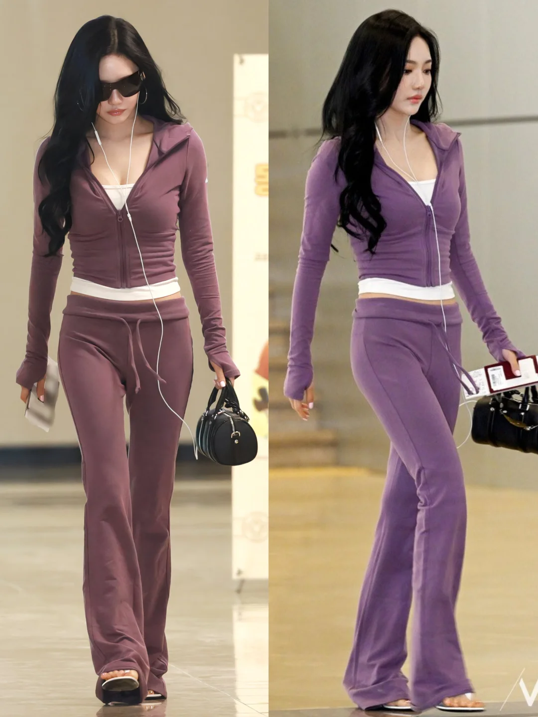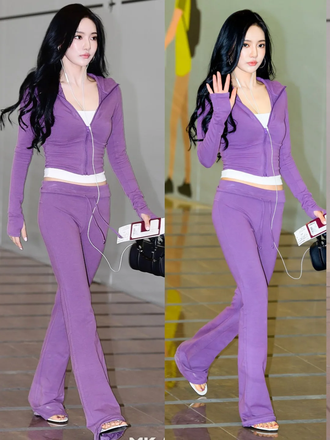 宁艺卓今日机场私服,紫色修身运动套装休闲舒适又很显身材!