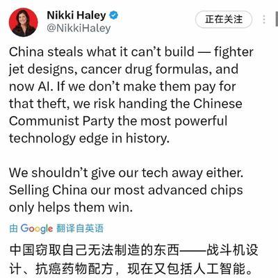说到底,黑利这出戏就是输不起,美国在科技领域当了这么多年老大,突然发现后起之秀追上来了,心里肯定不是滋味。