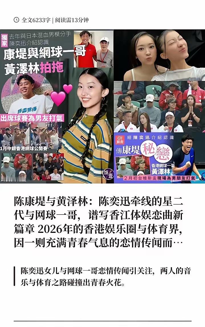 陈奕迅女儿回应新恋情陈奕迅女儿陈康堤公开恋情啦,男友是香港网球选手黄泽林。据陈康堤说,自己交往对象大多是家人介绍的,这次估计陈奕迅也出了不少力。陈奕迅爱打网球,先和黄泽林成了球友,才把女儿带上。网上扒出他俩之前互动明显,黄泽林发动态,陈康堤就点赞发爱心。比赛时陈康堤还会去看,有时还和陈奕迅一起。两人都21岁,读书体系相同,有共同话题。陈康堤接受采访时避重就轻的态度,也暗示了关系不一般。这对跨圈组合还挺般配,祝福他们!