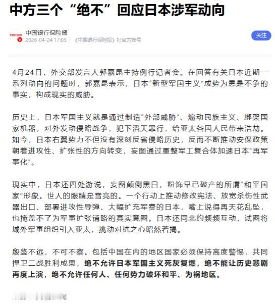 4月24号,针对日本最近干的那些糟心事儿,咱外交部直接甩出三个“绝不”,那话说得,硬气得很,一点儿都不含糊,这三个“绝不”就是咱的底线,也是咱中国政府和老百姓的态度,谁也别想碰。