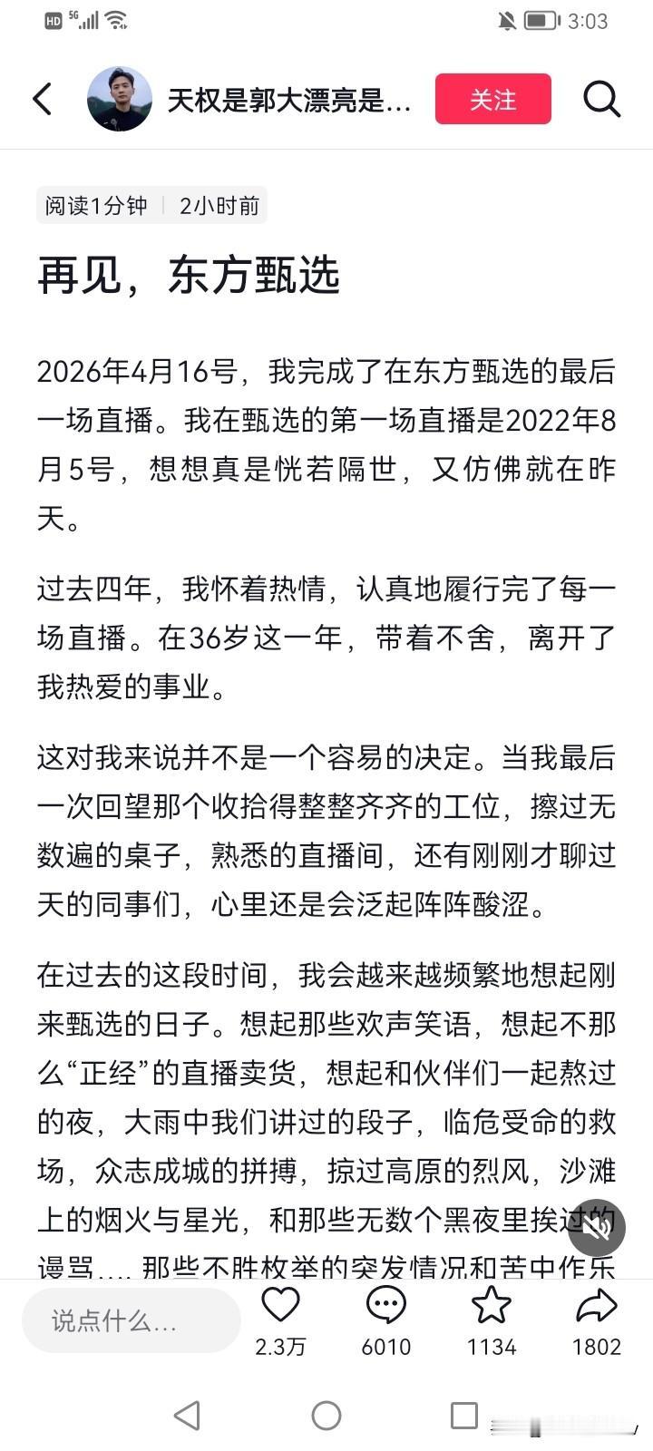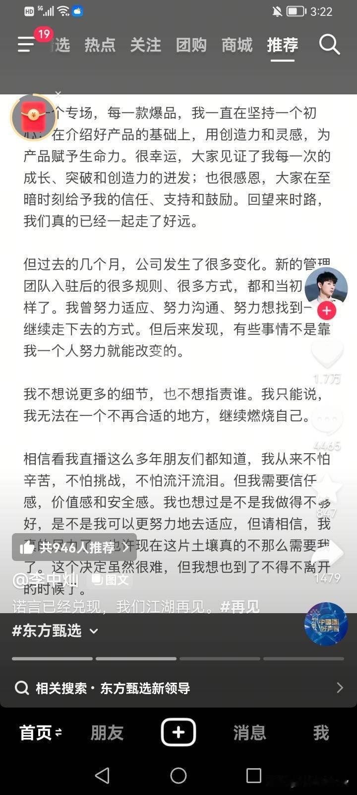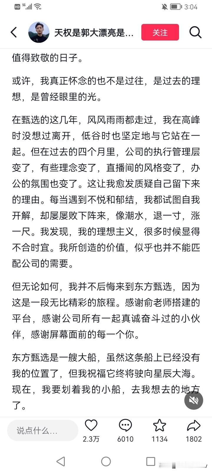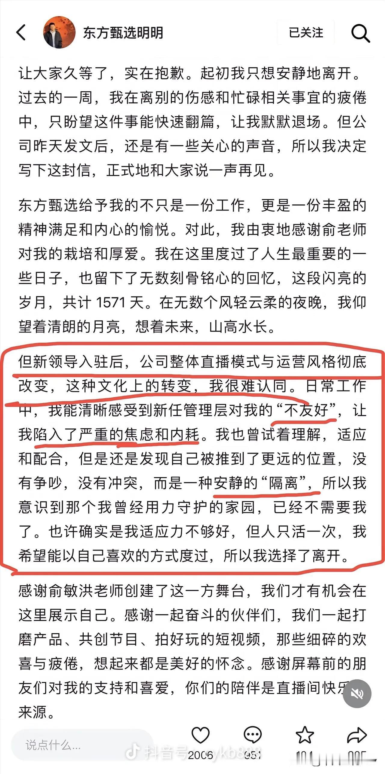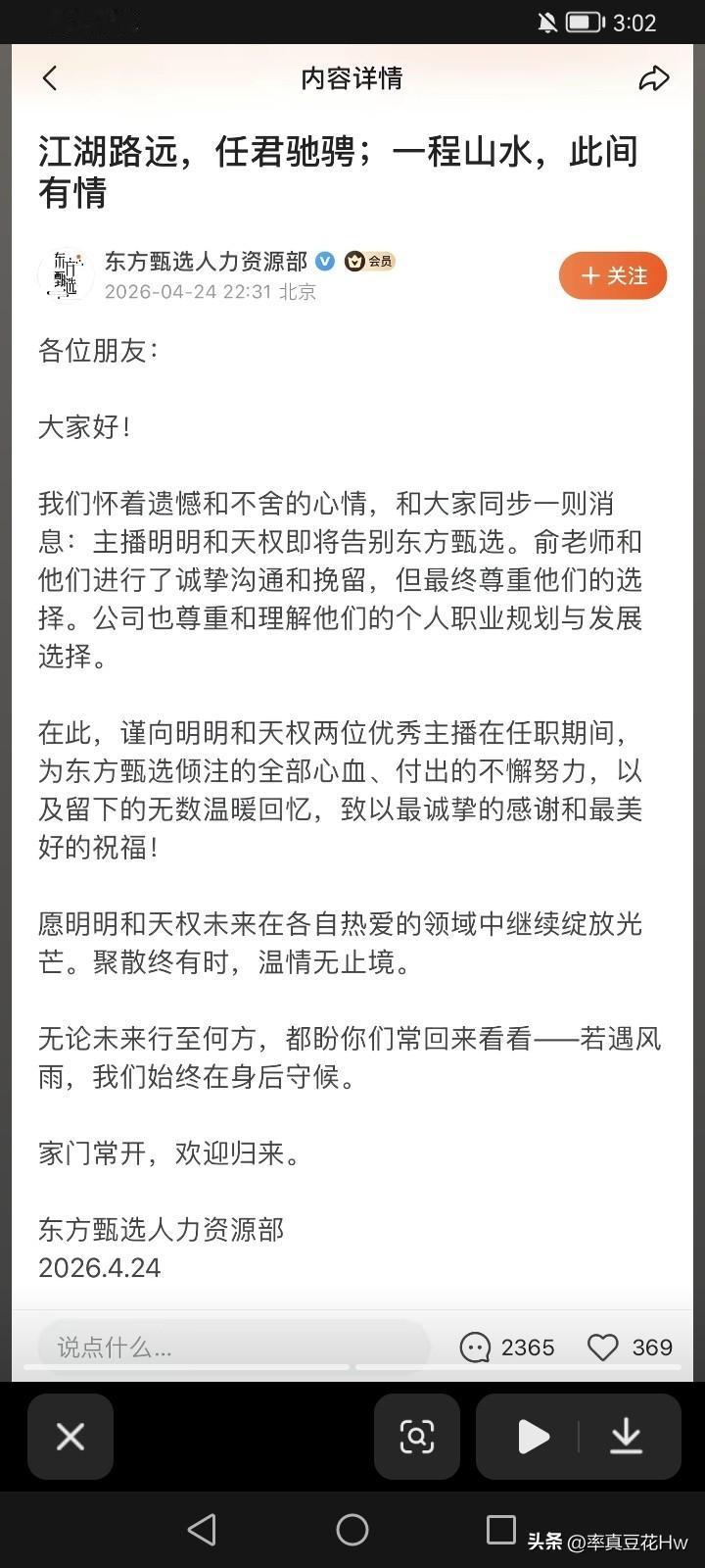东方甄选三名老将明明,天权和灿灿陆续发表各自离职的原因,文章中大家一致认为前几个