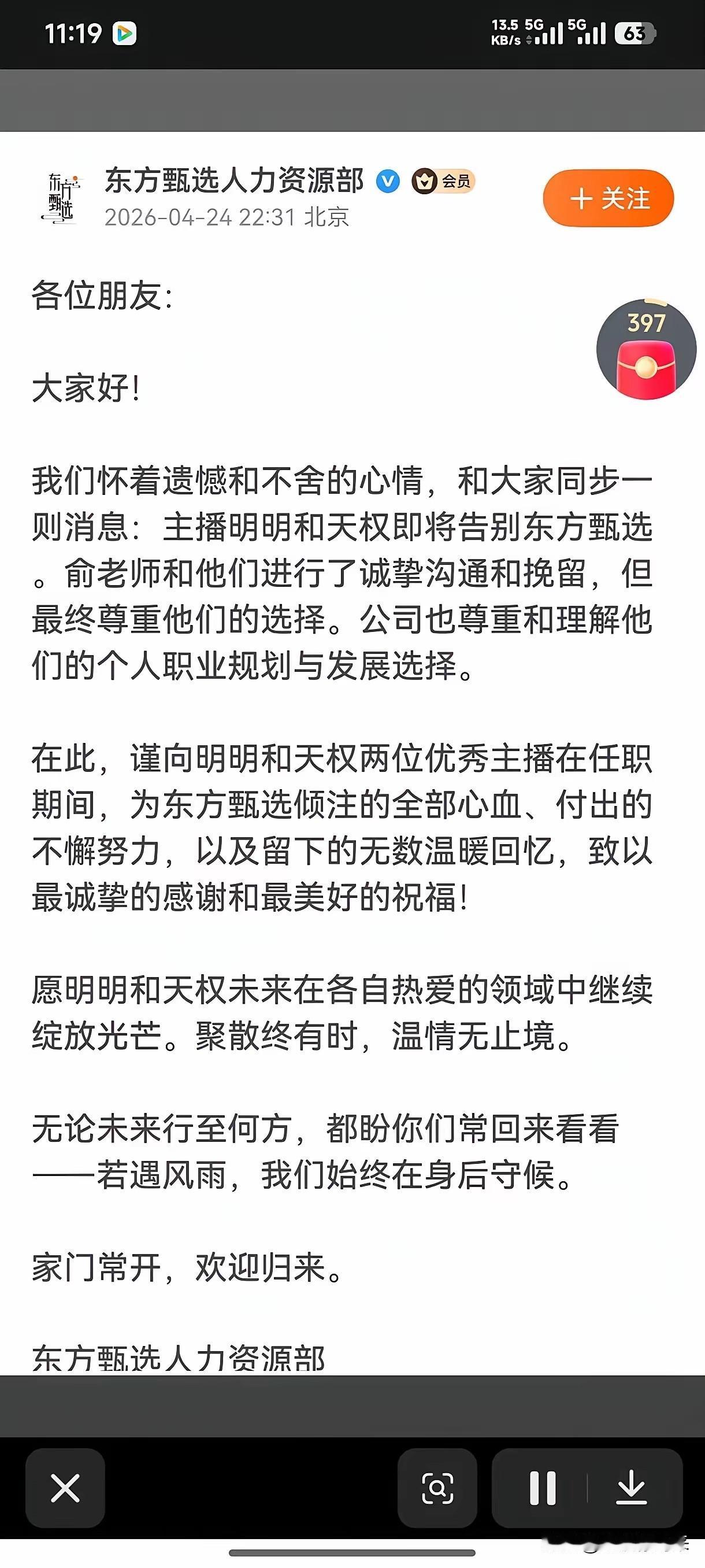 资本是逐利的,不可能跟你讲情怀。虽是公司的原创主播,但随着灵魂人物董宇辉的离开,原先的高报酬难以为继,公司必然会采取一系列“减薪增效”的措施!