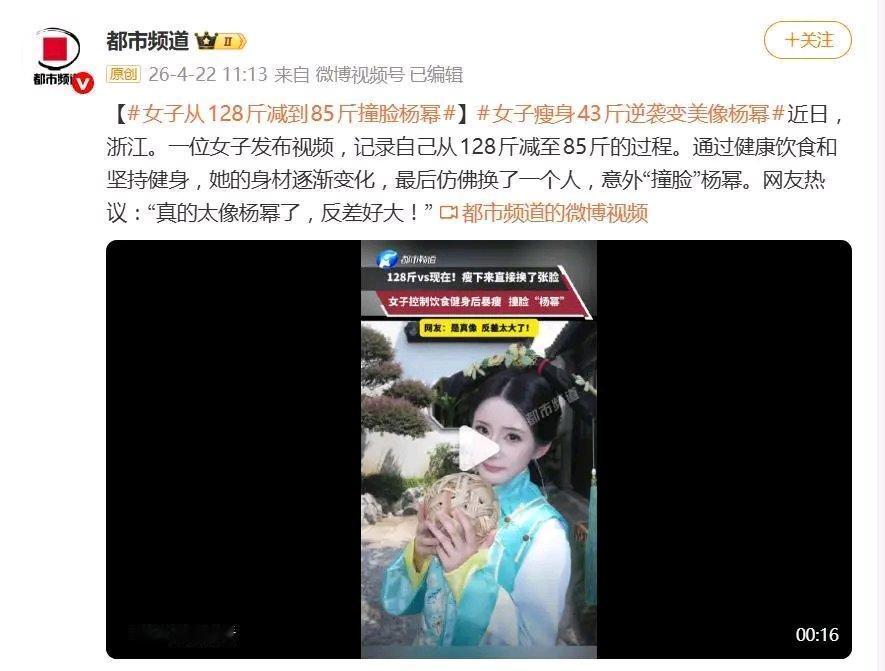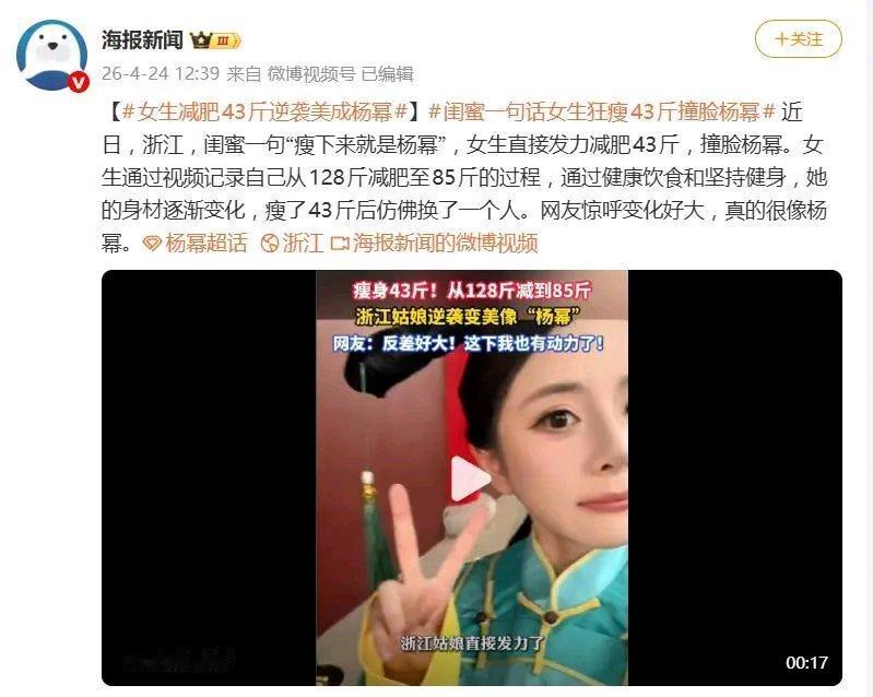 浙江这女生太牛了,从128斤减到85斤,直接“撞脸”杨幂,网友都直呼像。减肥前后