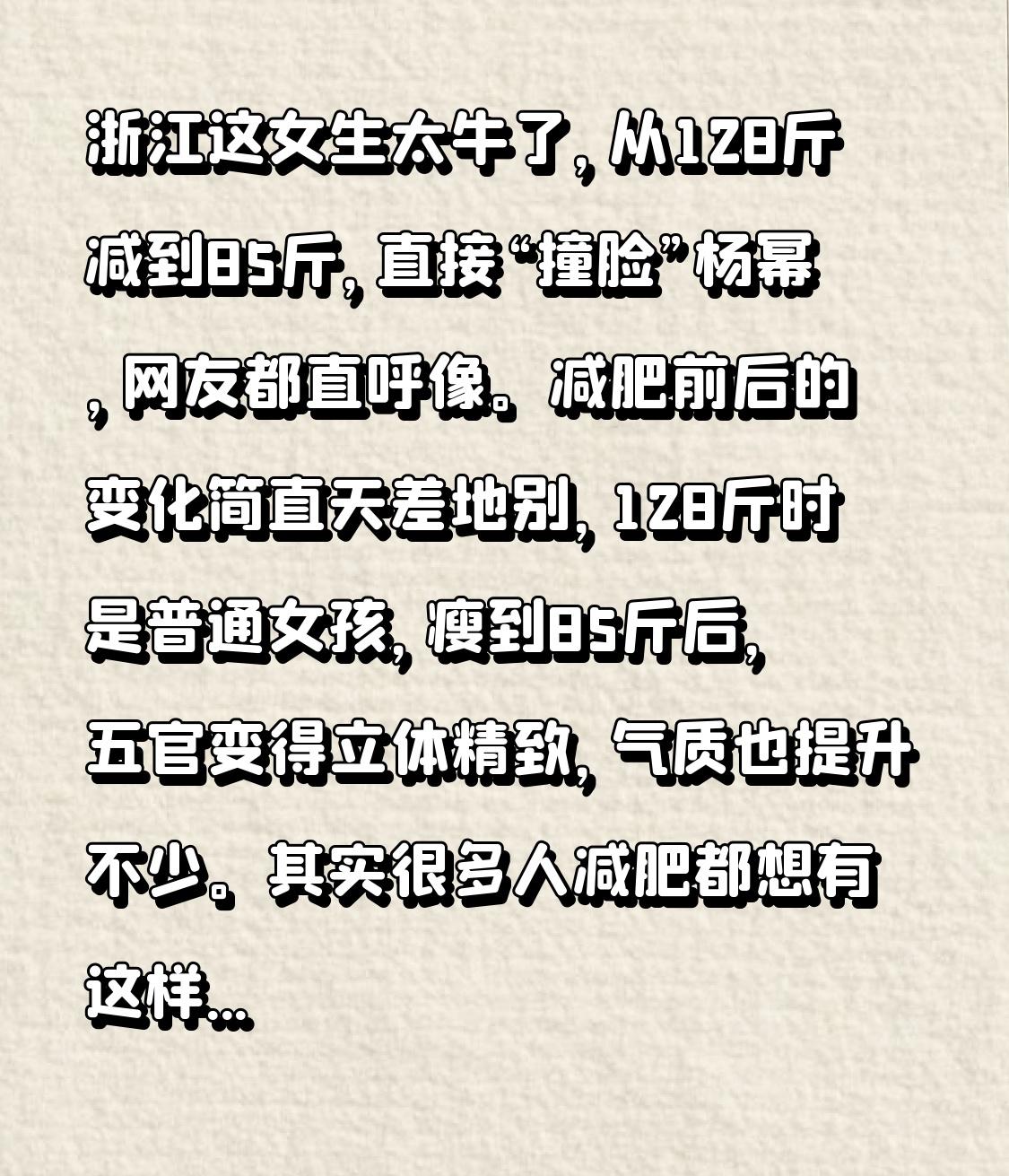 浙江这女生太牛了,从128斤减到85斤,直接“撞脸”杨幂,网友都直呼像。减肥前后的变化简直天差地别,128斤时是普通女孩,瘦到85斤后,五官变得立体精致,气质也提升不少。