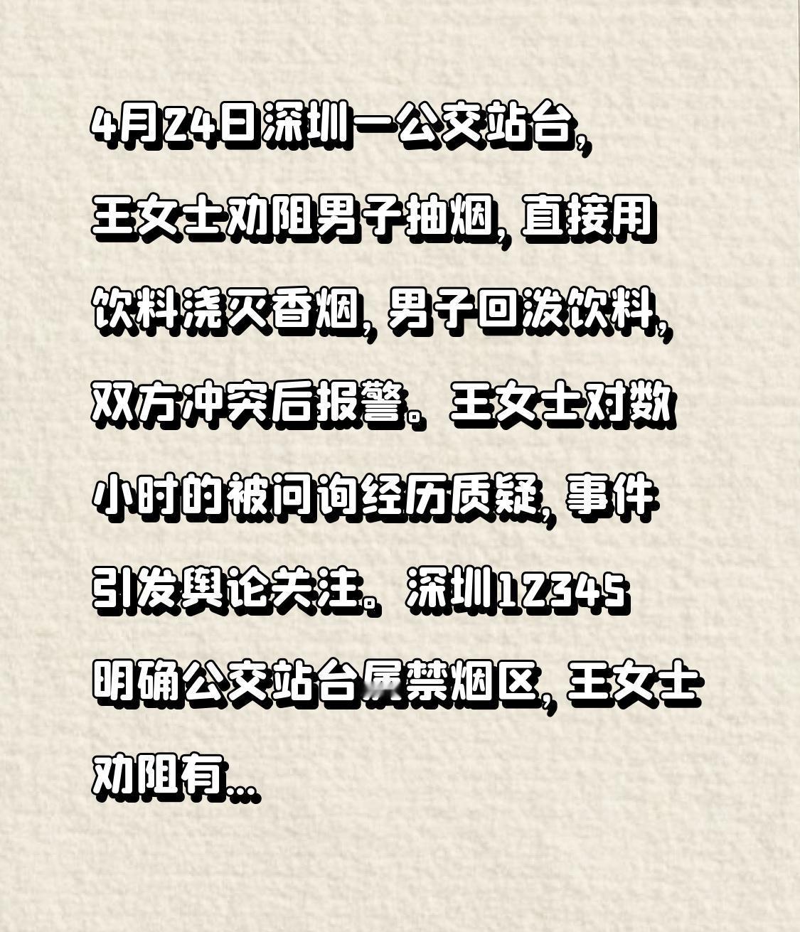 4月24日深圳一公交站台,王女士劝阻男子抽烟,直接用饮料浇灭香烟,男子回泼饮料,双方冲突后报警。王女士对数小时的被问询经历质疑,事件引发舆论关注。
