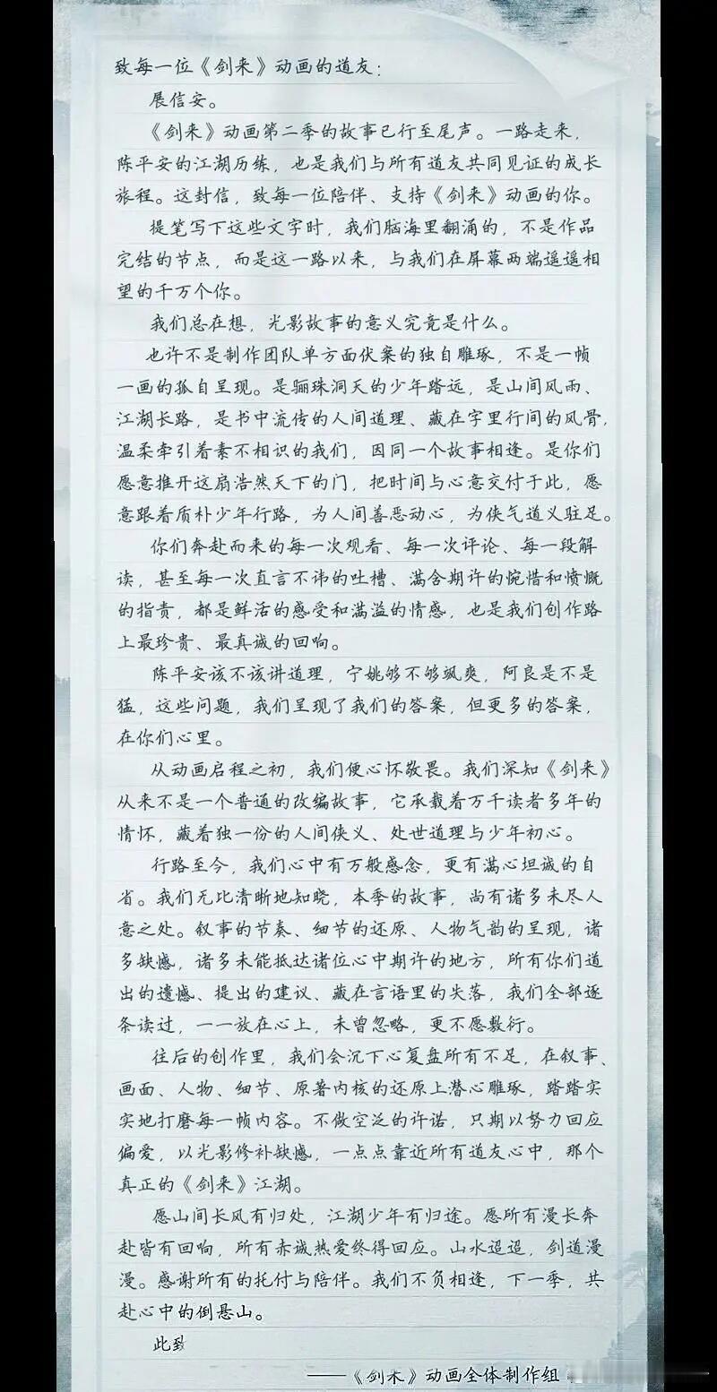 请查收剑来的500封信当快餐式互动成了常态,剑来偏用手写的温度对抗匆忙——五百封信里藏着的,是"我们和你们一样,都没从这个江湖里走出来"的共鸣。这样的剑来,值得等下去。