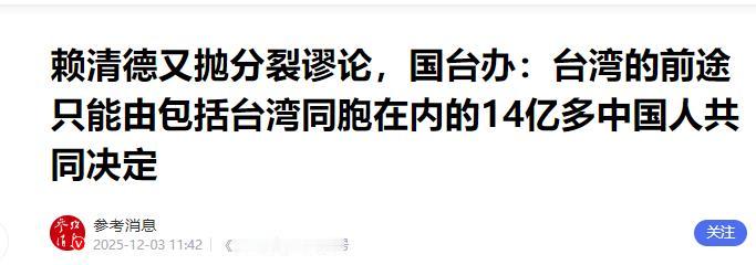 信息来源:《赖清德又抛分裂谬论,国台办:台湾的前途只能由包括台湾同胞在内的14亿多中国人共同决定》,参考消息,2025年12月3日。