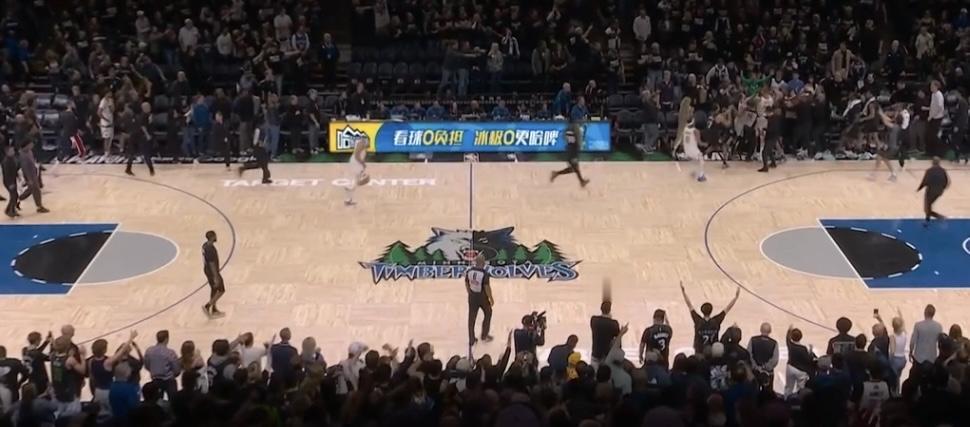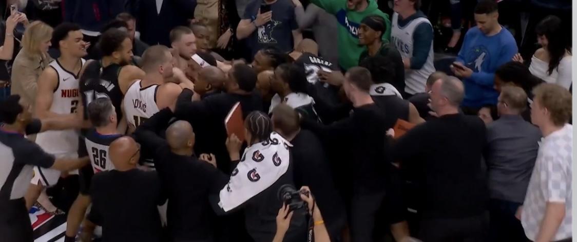 而看到麦丹最后还在进攻,约基奇愤怒了,憋了一整场的他,突然从后场冲向前场的麦丹,直接将他推到了森林狼替补席。