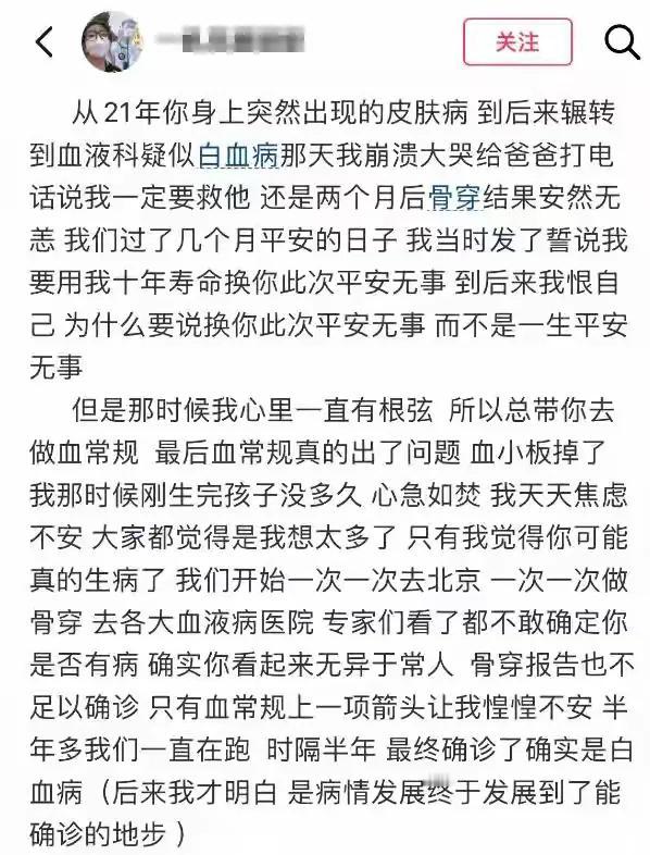 其实这事儿早在2021年就有苗头了,当时他脚背上莫名其妙长红点,人也总是疲惫不堪、夜里盗汗不止,但那时候觉得只是太拼学业太累了。折腾了两年多,因为妻子坚持一次次跑医院做骨穿,直到2024年才终于确诊,是一种全国不超过100例的罕见白血病。