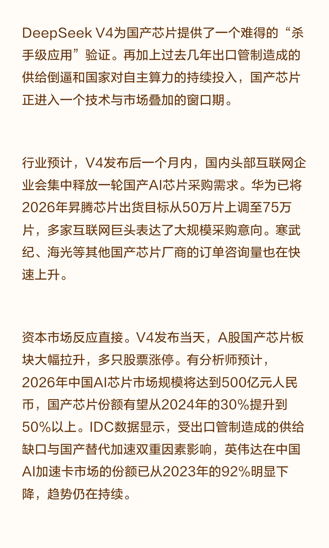 单卡推理性能达英伟达H20的2.87倍,成本仅为GPT-4的1/70,打破国产芯片无法跑顶级模型的预设,推动国产芯片市场发展。