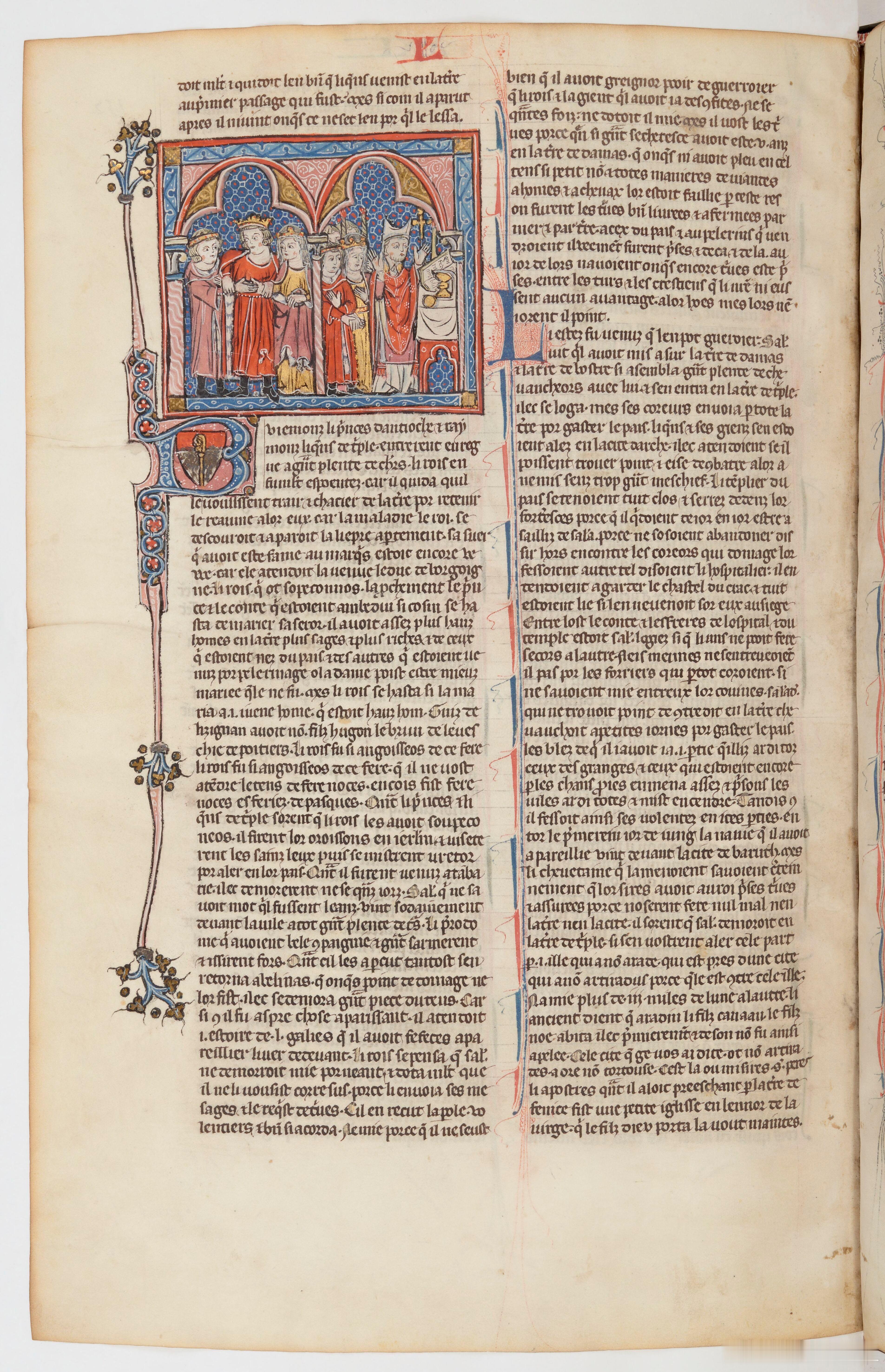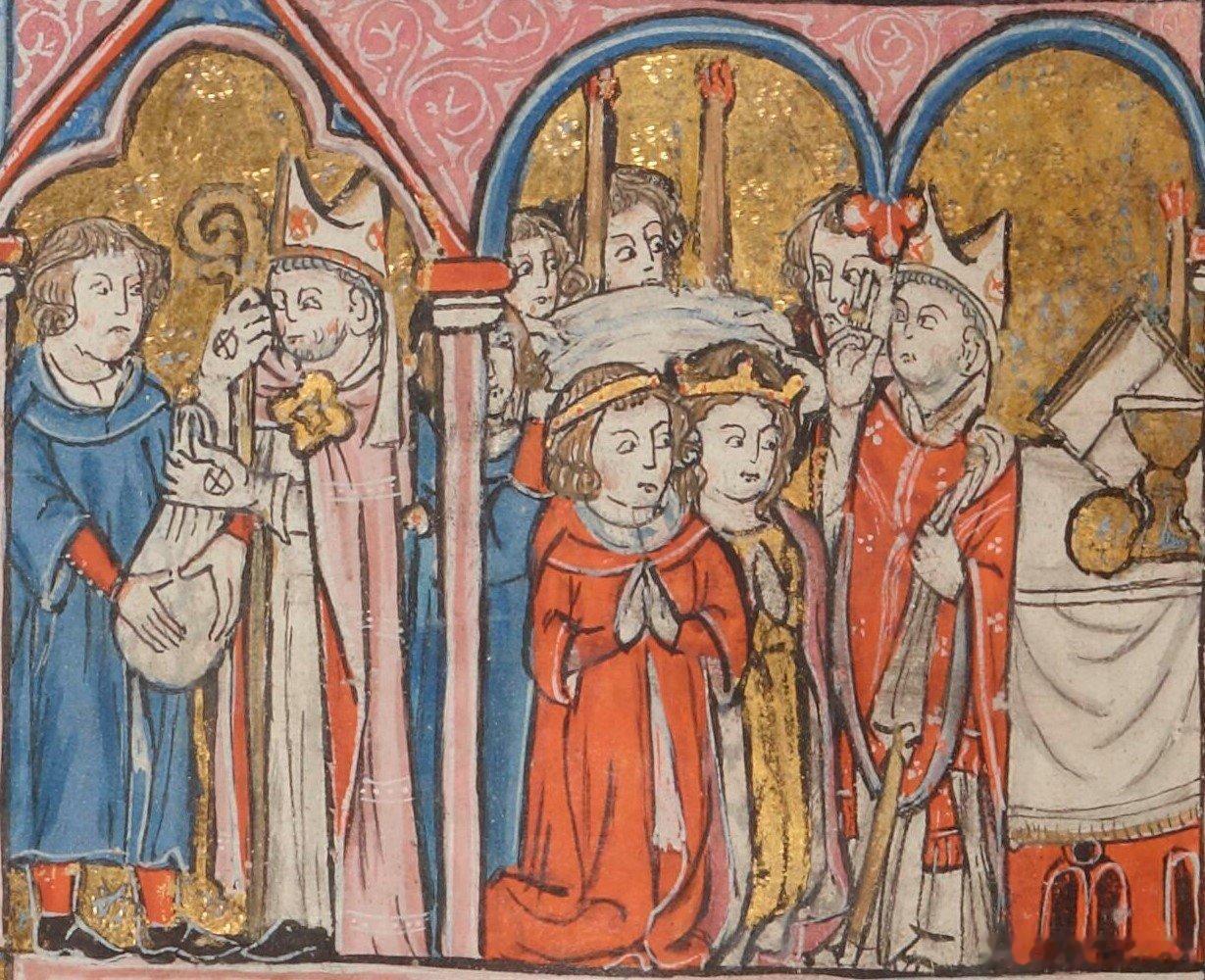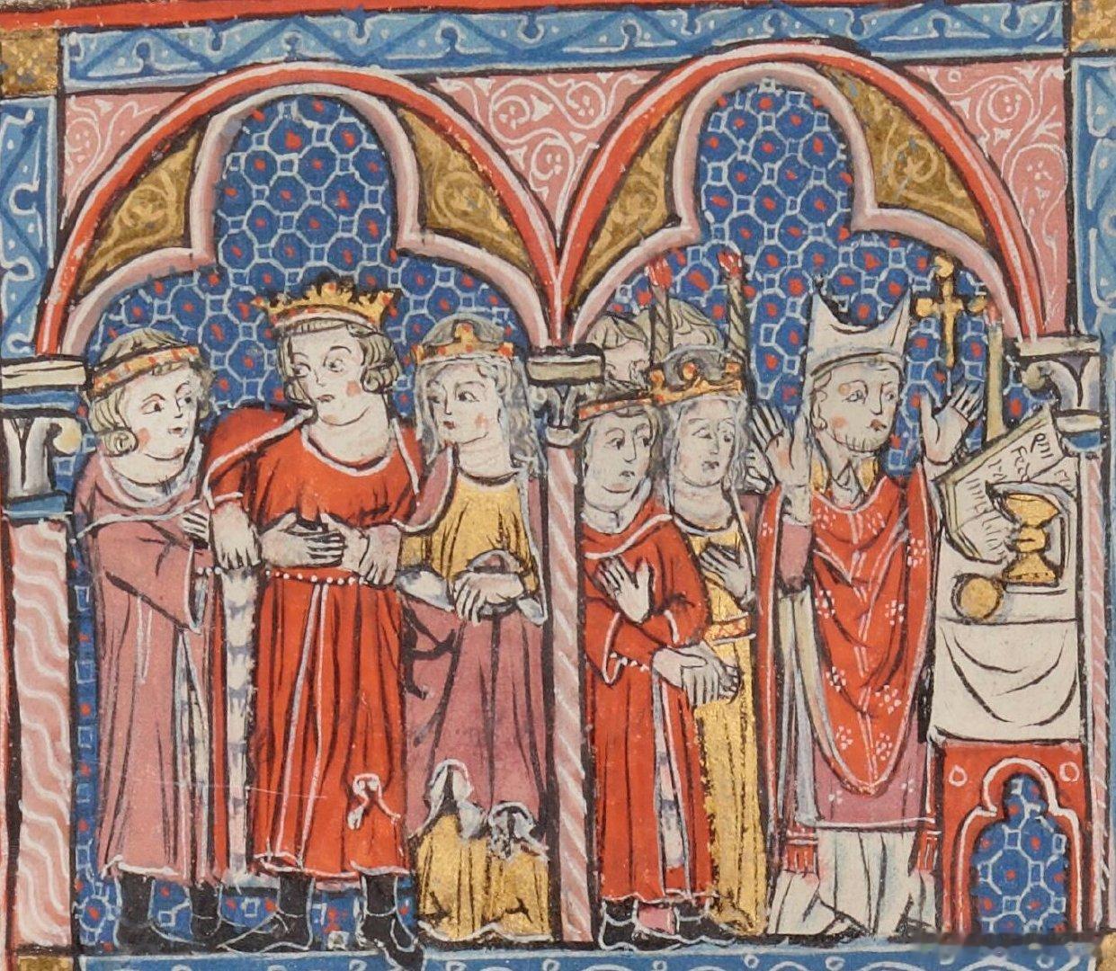 西洋历史文化鱼缸 中世纪插画中展现的耶路撒冷公主、女王伊莎贝拉一世(Isabella I,1172年—1205年)的两段婚姻。图1是她在鲍德温四世与太后阿格尼丝的安排下嫁给托隆的汉弗莱,当时年仅8岁。汉弗莱是沙蒂永的雷纳德的继子。图2是1190年阿卡围城战期间,生母玛利亚·科穆宁与继父伊贝林的巴利安绑架了公主,强迫她与汉弗莱离婚,11月24日改嫁给蒙费拉的康拉德(当时康拉德的拜占庭妻子尚在,而且未完成离婚手续)。插图2左侧显示汉弗莱为了钱“出卖”的妻子,是存在偏见的扭曲,这其实是一场小型宫廷政变。伊莎贝拉共经历4段婚姻,后三位丈夫都先后成为耶路撒冷国王。插画来自提尔的威廉的名著《海外纪事》(Historia rerum in partibus transmarinis gestarum,14世纪版本),法国国家图书馆收藏。