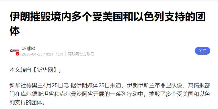4月25号伊朗官方正式通报,伊斯兰革命卫队雷霆出击,一口气捣毁了境内多个被美国以色列暗中扶持的不良团体,抓人、缴武器、端据点,整套操作干脆利落,看完真的大快人心。