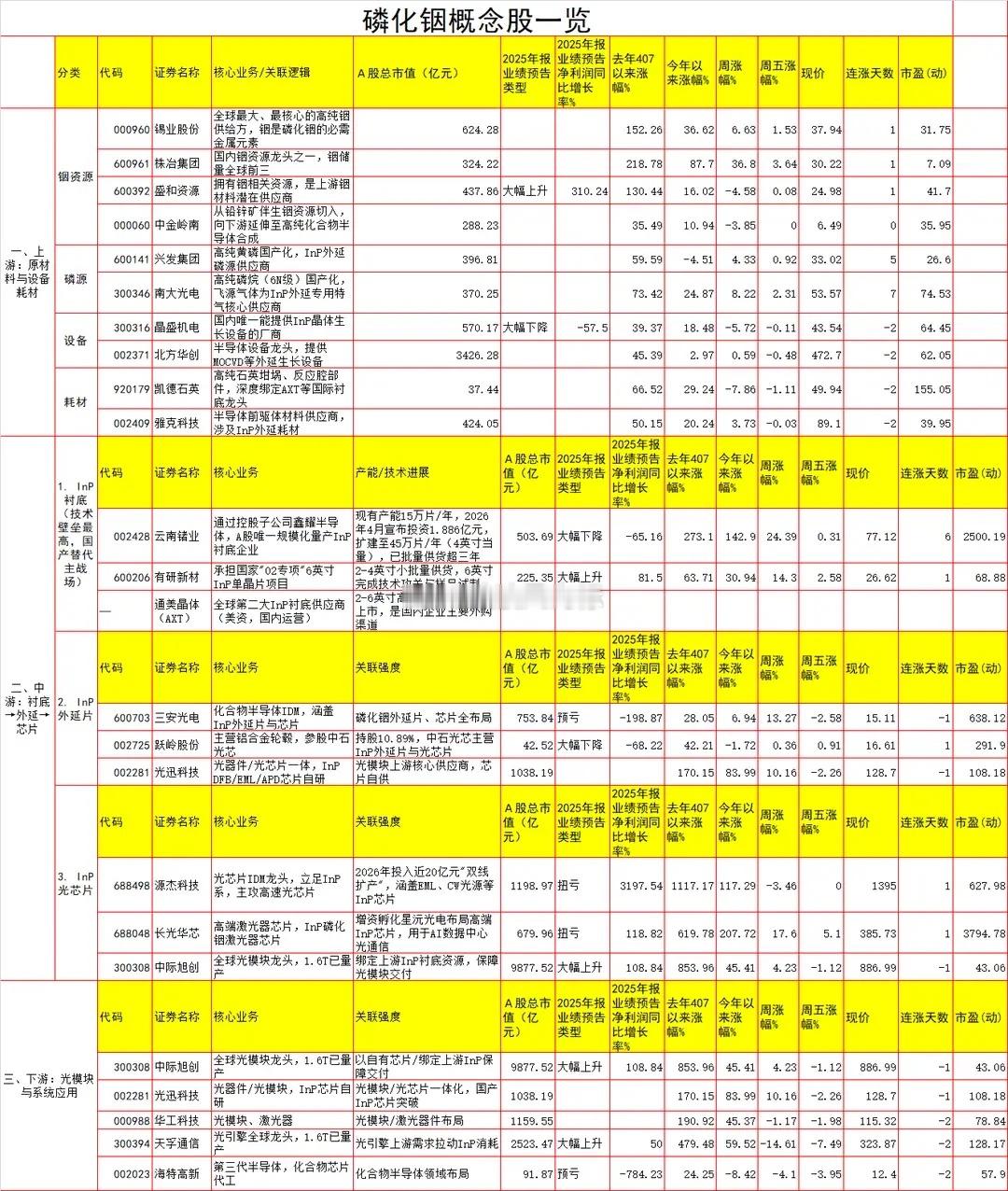 光模块拼命扩产,但材料才是那个被投资者忽略的“卡脖子”光模块这个赛道这两年火的一塌糊涂。中际旭创、新易盛、天孚通信,称之为A股市场的“易中天”,个个业绩高增长,主要得益于AI行业的高速发展。去年中际旭创净利润增长262%,新易盛增长76%,天孚通信也接近46%。一季报同样保持高增长。这两年别说拿着“易中天”会笑醒,就是与之相关链的个股也会躺赢,在A股市场选对了方向并坚定持有,完全可以实现财务自由。但光模块再牛,如果缺秒原材料,光模块的产能自然会受限的,所以光模块业绩大增的背后肯定少不了原材料业绩的大增。最近光模块的龙头们不光是晒业绩,还在集体喊一个词——“缺料”。中际旭创前几天在业绩会上说得很直白:1.6T已经量产出货,3.2T的产能也在准备,但光扩产还不够,因为原材料已经跟不上了。天孚通信更实在,直接说1.6T光引擎因为个别物料缺料,没达到预期的产量。巧妇难为无米之炊。今天咱们就聊聊,光模块扩产潮之下,真正的“隐形王者”——上游核心材料。▶ 磷化铟:缺口有多大?四块需求、一块供给,急单价格已翻三倍先讲磷化铟(InP)。听名字你可能觉得陌生,但在光模块的世界里,它几乎是绕不开的存在。无论是EML激光器、APD探测器还是高功率CW芯片,都得拿磷化铟当基底。最关键的是——没有量产替代方案。而且从用量来看,1.6T光模块需要的磷化铟衬底,是800G模块的2.7到2.8倍。随着1.6T放量,单模块的原材料消耗量是翻着倍往上走的。那供给端呢?惨不忍睹。数据显示,2026年全球磷化铟需求大约260万到300万片,但有效产能只有60万到75万片——缺口超过70%。也就是说,市场上每四片需求,只有一片能真正供上。急单现货价已经突破3000美元一片,6英寸高端衬底更夸张,从1400美元直接飙到5000美元,涨幅超过250%。更麻烦的是,扩产不是今天说扩就扩。磷化铟生产门槛极高,单条产线投资就要超过12亿元,良率爬坡需要三到五年。就算现在所有厂家一起上马,也得等两三年才能真正放出产能。一句话总结:短期没救,价格还得涨。▶ 薄膜铌酸锂:3.2T时代的“终极方案”,远期预期拉满如果说磷化铟是当下最确定的“现实收益派”,那薄膜铌酸锂就属于“未来想象派”——但它的想象力,大得离谱。为什么?因为到了3.2T时代,单通道调制速率需要达到400G,传统材料已经撑不住这个带宽了。而薄膜铌酸锂的优势是——超高带宽、低功耗、低驱动电压。说得通俗点,别人跑不动的速度,它跑得动;别人用着发热发烫的功耗,它省得多。华泰证券算了一笔账:到2031年,仅3.2T光模块带动的薄膜铌酸锂调制器市场空间就有可能接近30亿元,2029年到2031年的复合增长率高达271%。怎么理解这个数字?就是每一年差不多翻两倍多。但要提醒一句:薄膜铌酸锂目前还处于从0到1的导入阶段。3.2T光模块预计2027到2028年才开始商业化验证,也就是说真正的大批量需求爆发,可能还要等两三年。这是远期逻辑,短期弹性不如磷化铟猛,但长线天花板更高。▶ 哪些公司值得关注?重点聊聊两个方向里的核心标的先说磷化铟方向。云南锗业(002428)是目前国内唯一量产磷化铟衬底的头部企业,现有产能15万片/年(2-4英寸),子公司云南鑫耀和华为主导的光芯片厂商中际旭创等都已经完成了认证。更重要的是,它的产品因为光通信市场需求增加和原材料价格上涨,价格还在往上走。2025年上半年营收大增52%的背后,磷化铟销量占比提升是重要推手。云南锗业有自己的磷化铟晶片生产线和上游锗资源,在这个赛道里属于“有点稀缺”的选手。另外,博杰股份(002975)参股的珠海鼎泰芯源也在扩产,磷化铟项目已正常开展业务。不过必须说一句,云南锗业现在的估值已经被市场充分挖掘了。3月份它就因为磷化铟概念收获过“三天两板”,公司已经明确表示暂时没有大的扩产计划。后续能不能继续超预期,要看6英寸大尺寸产品的良率突破和出货进度。再看薄膜铌酸锂方向。天通股份(600330)在这个领域掌握了自己制备铌酸锂晶体材料的核心技术,是国内为数不多能从上游晶体做到下游器件的企业之一。光库科技(300620)是国内唯一能量产薄膜铌酸锂调制器的公司,3.2T方案已在送样,在远期市场里有非常强的竞争地位。福晶科技(002222)则是光模块上游另一个不可忽视的存在,能提供铌酸锂晶体、磁光晶体等核心材料,客户遍布Lumentum、II-VI等国际光通信巨头。其中,光库科技尤其值得长期跟踪。因为3.2T方案一旦大规模落地,光库科技是确定性最强的国产标的,没有之一。▶ 看完想冲进去?先别急,说说风险说了这么多,无非是想告诉大家:光模块扩产的底层驱动,是材料的需求爆发。但这个逻辑成立,不代表你现在冲进去就一定赚钱。风险在哪?主要有这么几条:首先,估值已经很高了。 像云南锗业这种核心标的,从去年到现在股价已经走了好几轮主升浪,涨幅非常夸张。磷化铟概念也早就被资金疯狂追捧,很多跟光模块沾边的公司,股价都比基本面跑得快。行业泡沫风险真实存在。其次,技术替代的不确定性。 光模块的技术路线,从EML到硅光,从可插拔到CPO,大家都在找更低功耗、更低成本的方案。虽然目前磷化铟在高速场景下不可替代性很强,但技术迭代这件事没有绝对的安全区。再次,供应瓶颈终会缓解。 虽然扩产周期长达2-3年,但所有厂商都在加码。美国AXT目标2026年底产能翻倍,Lumentum拟扩充
