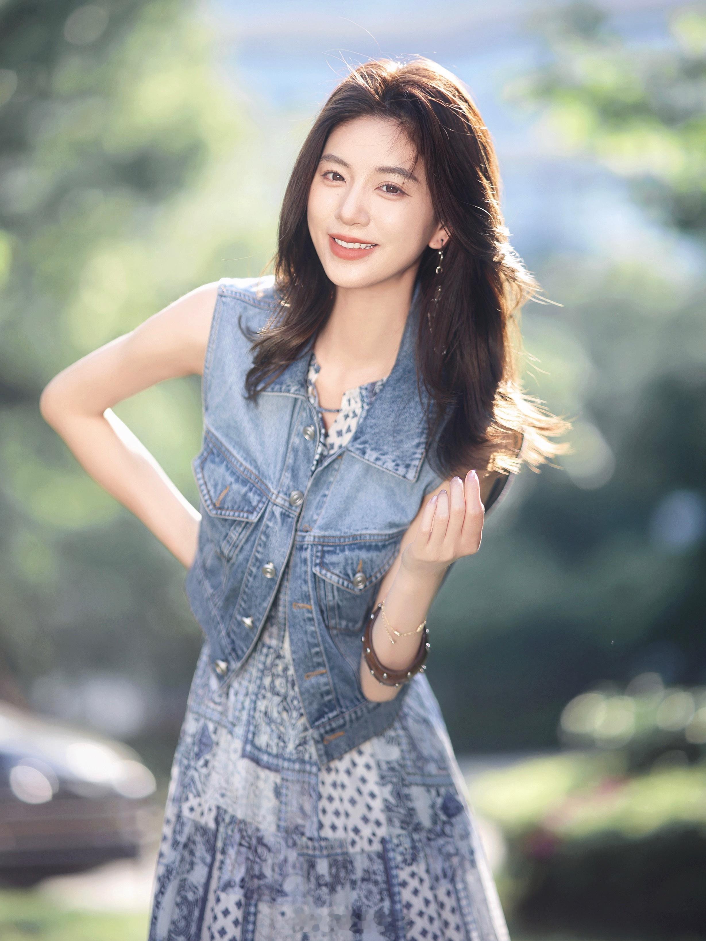 被张小斐的穿搭惊艳到!墨绿色T恤+高腰阔腿牛仔裤,显瘦又显高。宽松版型遮肉舒