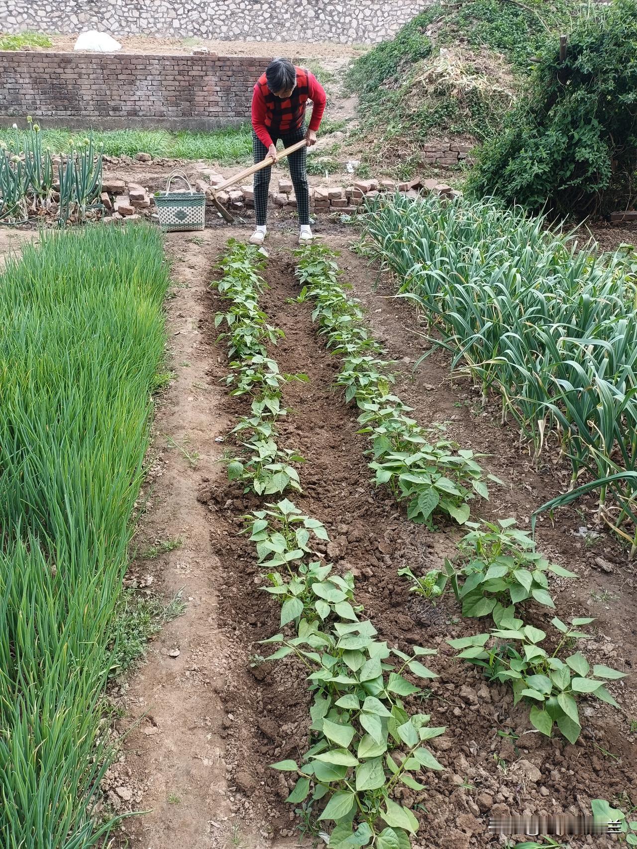 老妈给豆角松土,每天老妈都去菜园干活,最近老妈身体特别好,看着老妈在菜园里干活儿,我觉得自己特别幸福。