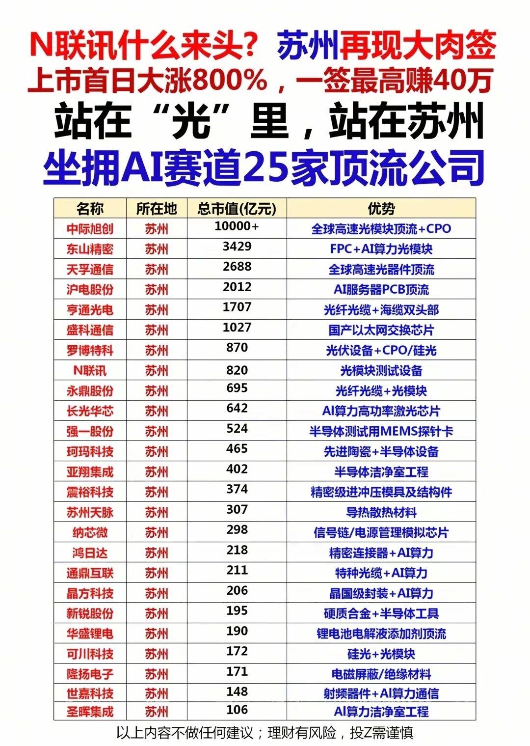 ✅ 苏州光链军团:中际旭创、天孚通信等25家顶流扎堆,AI算力光模块、CPO、高速器件全链条领跑,光模块新股上市首日暴涨800%,一签狂赚40万,站在“光”里的苏州,正在定义AI算力的中国高度。