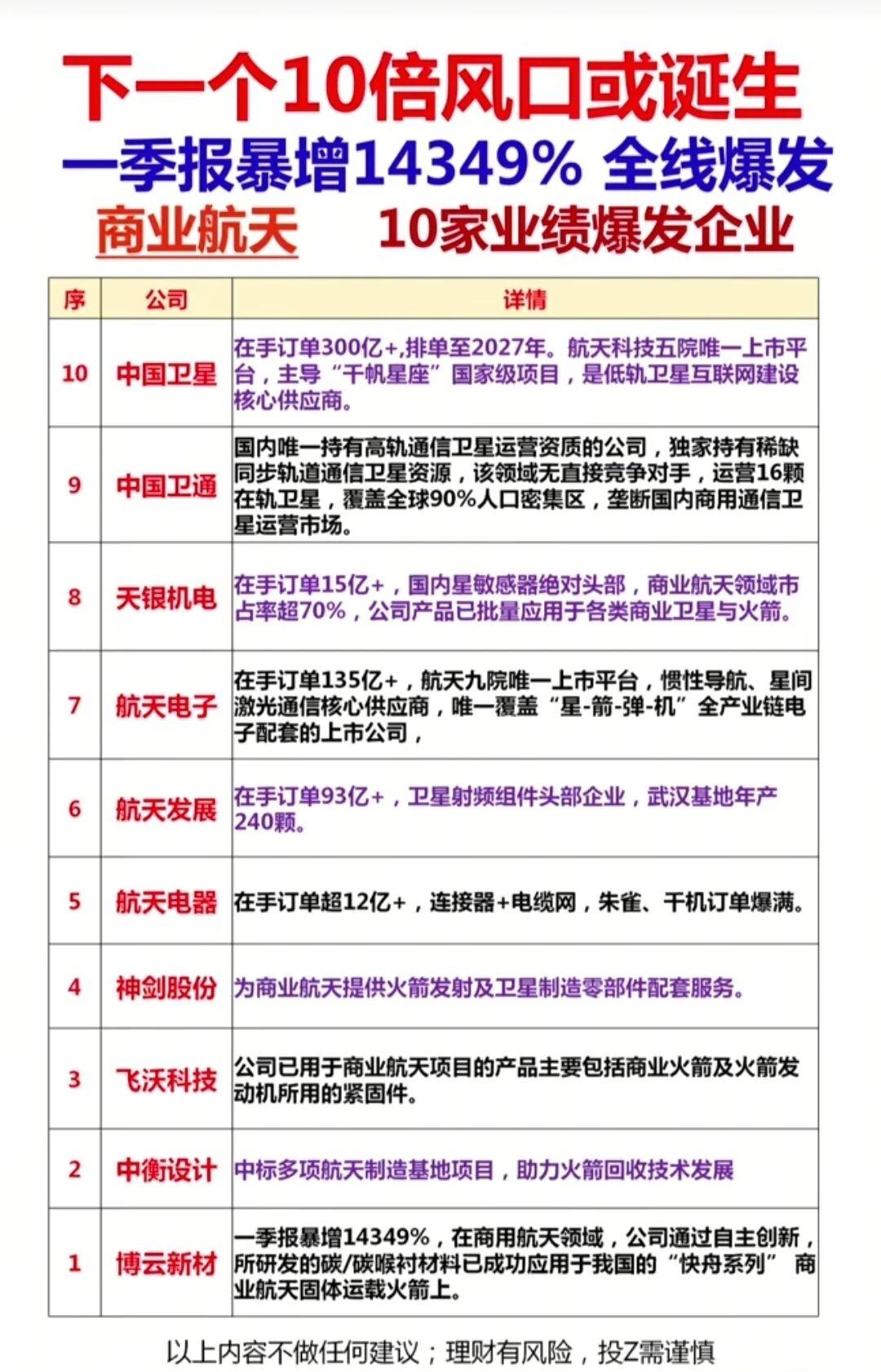 ✅ 商业航天新赛道:中国卫星、中国卫通、博云新材等10家企业订单爆量,一季报最高暴增14349%,低轨卫星互联网、星箭配套全产业链爆发,下一个10倍风口已在路上。