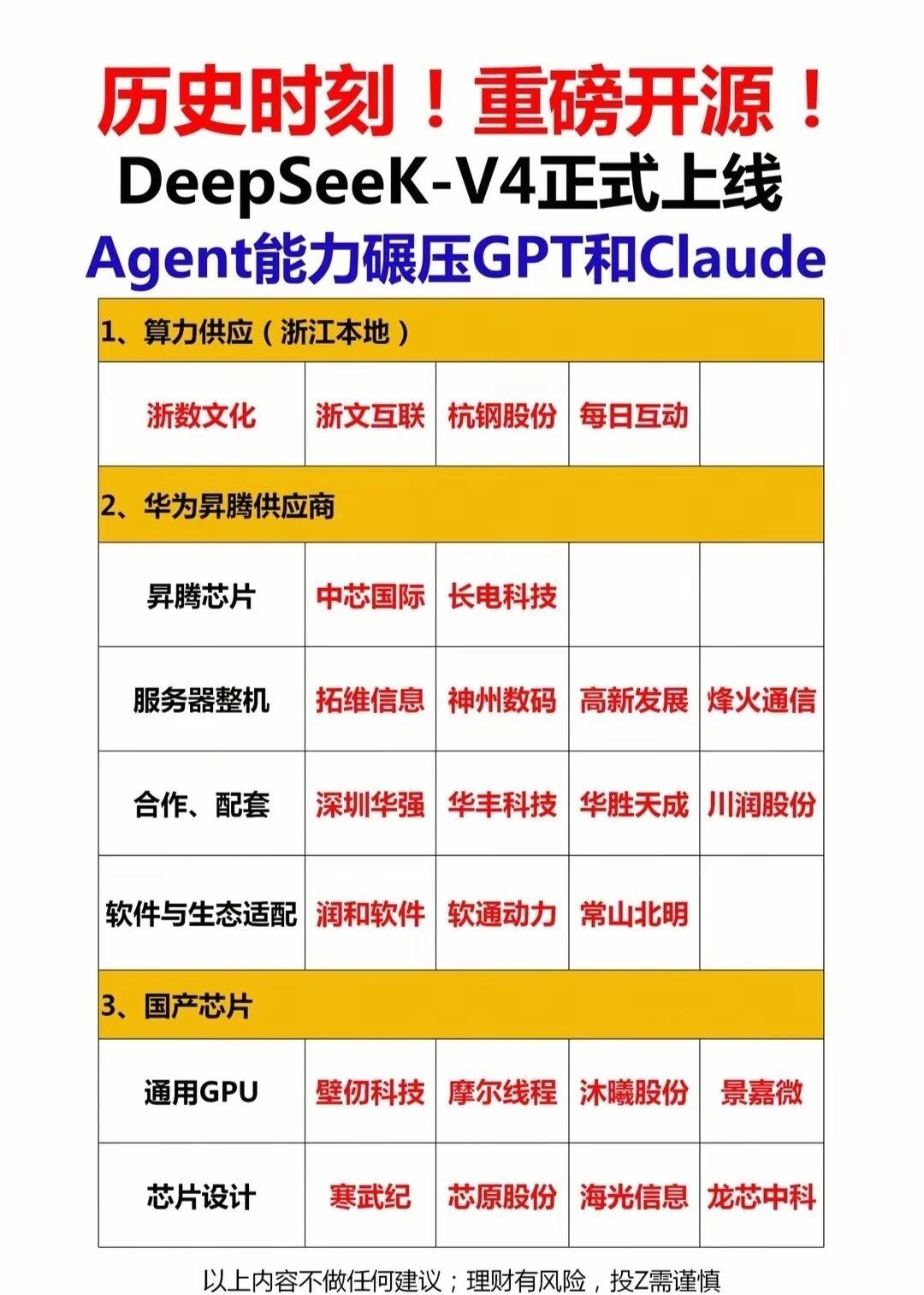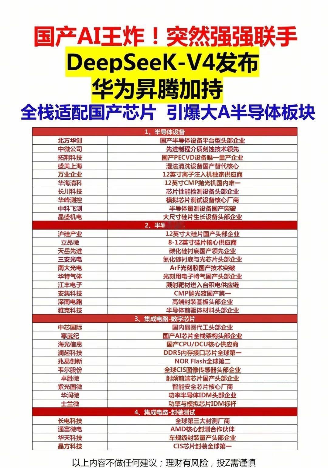 ✅ 国产AI硬核突围:DeepSeek-V4携华为昇腾全栈适配国产芯片,半导体设备、材料、芯片、封装全链条国产替代加速,北方华创、中芯国际、寒武纪等核心企业集体发力,国产算力生态彻底打通。