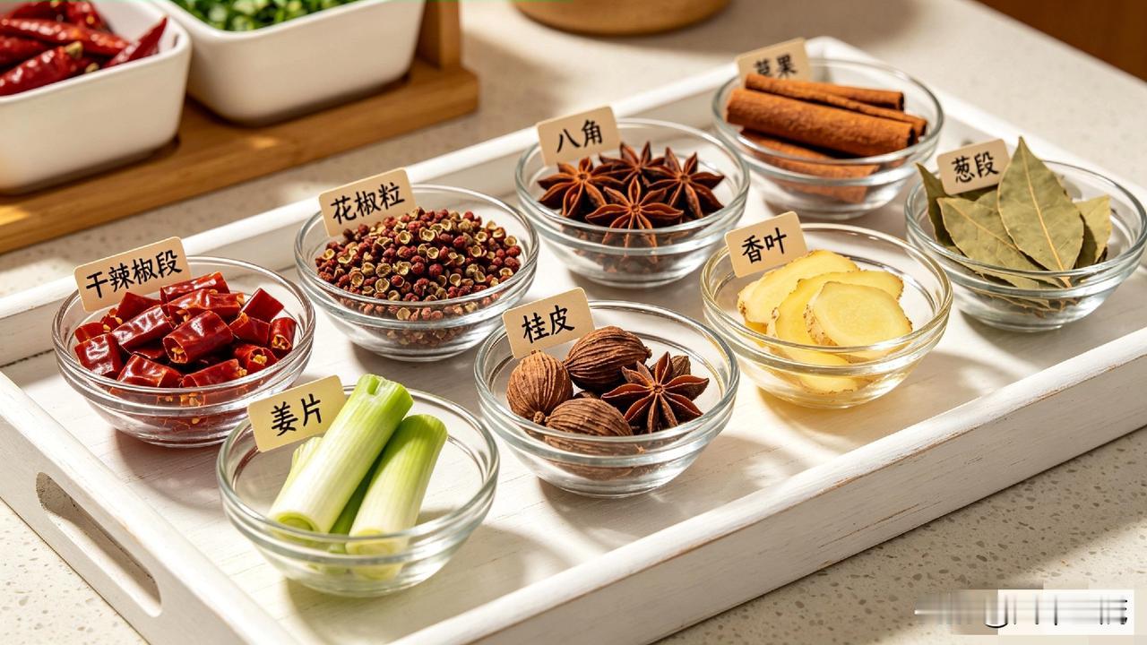 - 香料包:八角3个、桂皮1小段、香叶4片、花椒15粒、干辣椒6个、草果1个(拍裂)、陈皮1片、小茴香5g。这些香料搭配在一起,能激发出浓郁的卤香。